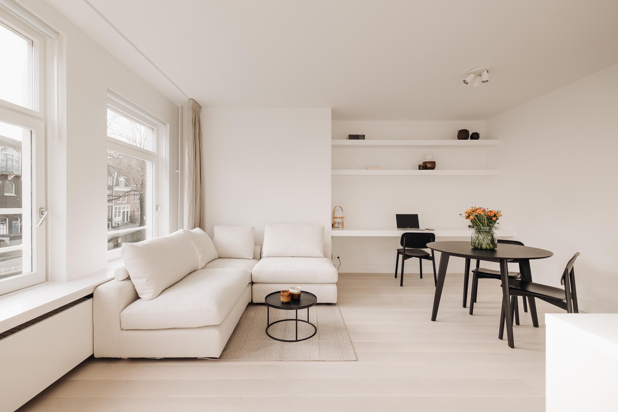 Bij binnenkomst heeft u aan uw rechterhand veel kastruimte om te gebruiken als garderobe. Vervolgens komt u in de ruime woonkamer met open keuken die beschikt over veel natuurlijk daglicht. Vanuit een van de drie grote ramen kunt u uitkijken op de gracht. De fijne hoekbank en flat-screen TV geven u de gelegenheid om heerlijk thuis te komen na een lange dag. Ook heeft de woonkamer aan de zijkant een werkplek waar uw rustig thuis zou kunnen werken. De nieuwe keuken is stijlvol ontworpen en is van alle gemakken voorzien, zoals een elektrische inductiekookplaat, oven, koelkast en vriezer. Ook dient het kookeiland als bartafel waar aan gegeten kan worden. De ruime slaapkamer heeft een tweepersoonsbed. Daarnaast is er ingebouwde kastruimte waar u al uw kleding in kwijt kan. De badkamer beschikt over een wastafel met opbergruimte, een regendouche en een toilet. De houten wand naast het toilet is een schuifdeur waar een wasmachine en droger achter staan. De woning is ook gekenmerkt door de zwarte details die overal in de woning terug te vinden zijn, zoals de mooie zwarte woonaccessoires in de woonkamer, de zwarte stalen deuren en de zwarte details in de badkamer. Indien gewenst wordt het appartement turn-key opgeleverd.