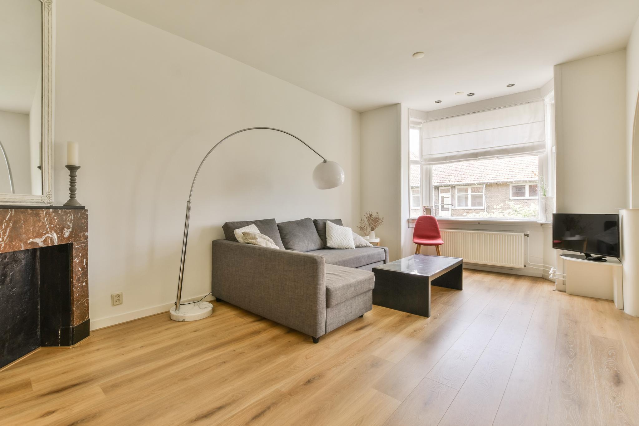At the front is the L-shaped living room with bay window where a lovely sitting and dining area is realized. The modern kitchen is located at the rear. This is equipped with luxury appliances, a refrigerator, freezer, dishwasher, oven / microwave, induction hob and hood. You will also find a bar table with two stools and access to the sunny balcony. The bedroom is also located at the rear, also with access to the balcony and equipped with a double bed and a walk-in closet. The sleek bathroom has a shower, sink, toilet and design radiator. On the 4th floor is access to the lovely roof terrace and a spacious storage room with washing machine connection and HR boiler.