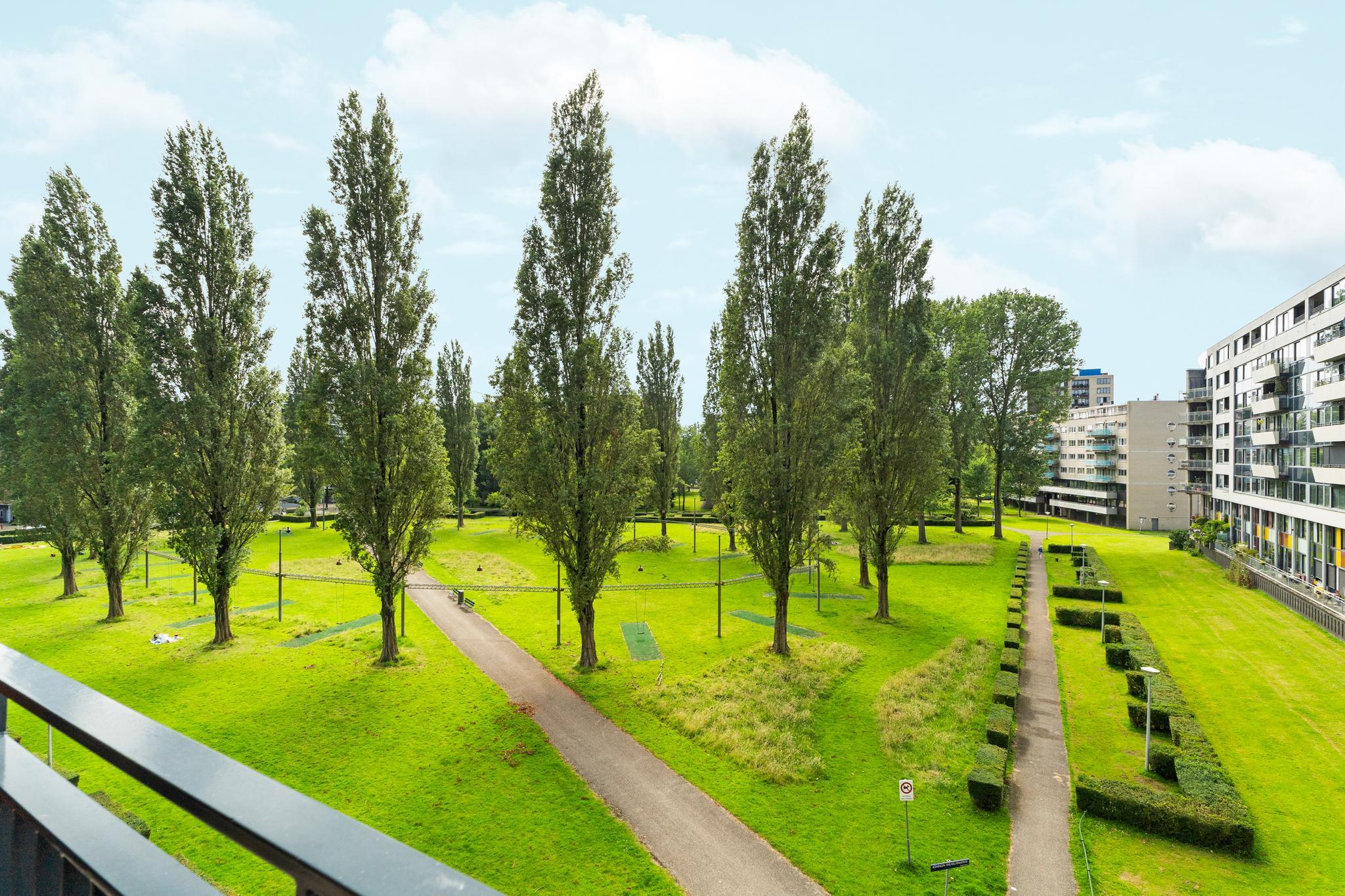 Gelegen aan de achterzijde van het appartement is de ruime woonkamer, met een grote raampartij welke uitzicht biedt op het Wilhelminapark. Tevens is via een deur het balkon te bereiken, welke op het westen gelegen is. Ook aan de achterzijde van het appartement gelegen, dus gelijk ook grenzend aan het balkon, zijn beide slaapkamers. De eerste slaapkamer biedt ruimte aan een tweepersoonsbed en kledingkast, maar kan ook goed functioneren als thuiskantoor. De grootste slaapkamer geniet meer dan 18m2 aan oppervlakte, met een openslaande deur naar het balkon. Aan de rechterzijde van het appartement is de badkamer te vinden, welke beschikt over een comfortabele douchecabine en een fijn ligbad.