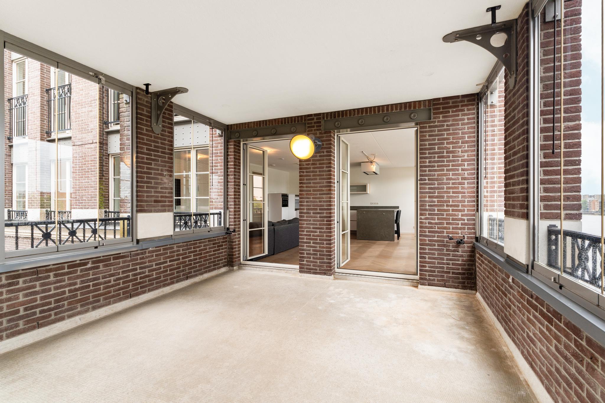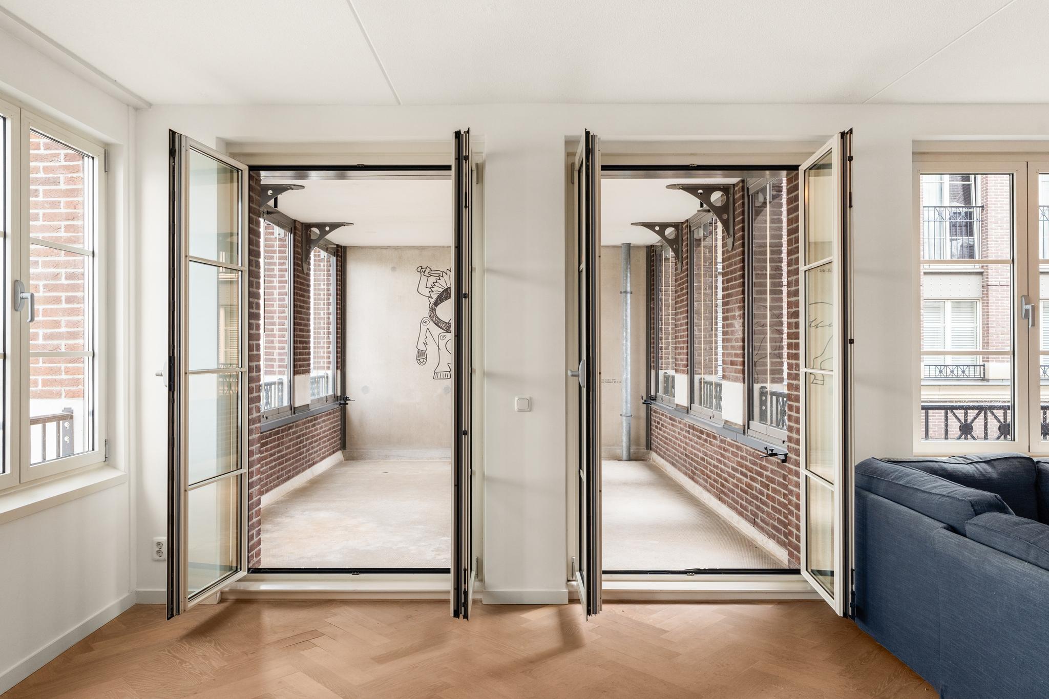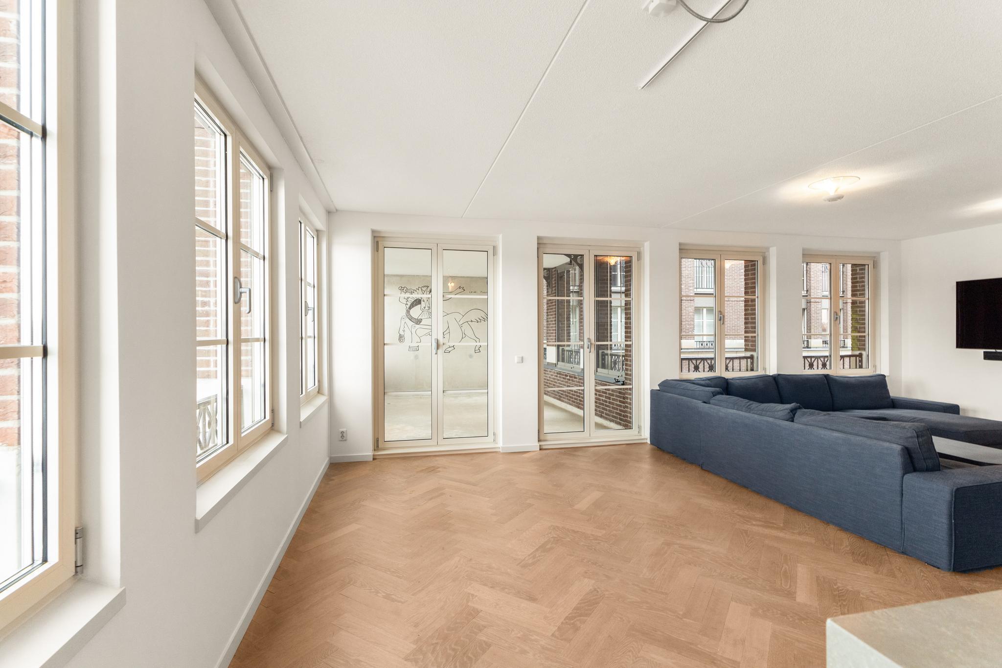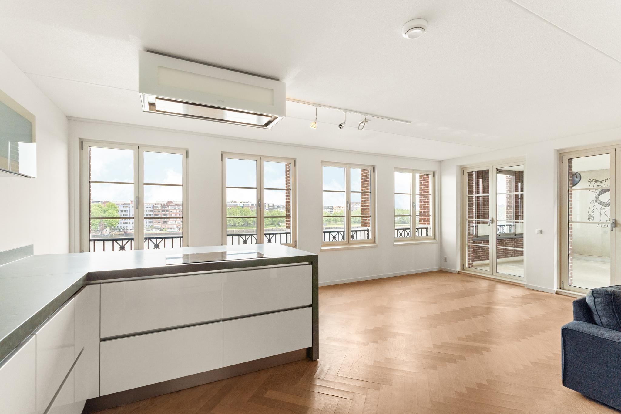 Smaakvolle living met mooie eiken visgraat vloer met vloerverwarming. Veel licht door de hoekligging met vele ramen en de openslaande deuren naar het aangrenzende terras. Vanuit de living prachtig weids uitzicht over de IJhaven en een doorkijk naar het IJ. De perfecte plek met Sail Amsterdam.