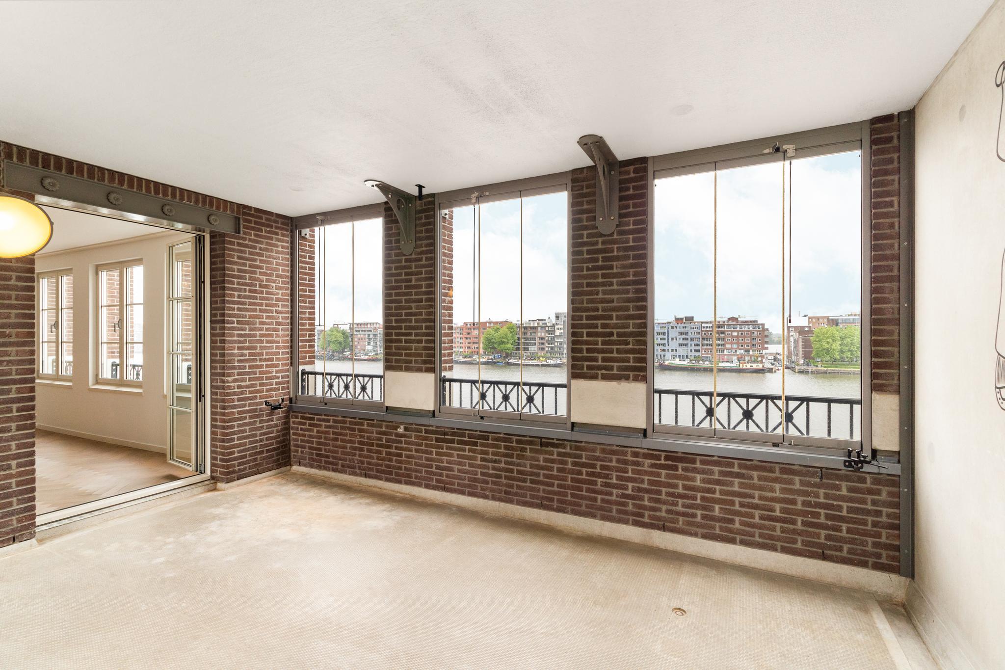 Ruim terras te bereiken via de openslaande deuren vanuit de living. Prachtig uitzicht over de IJhaven met een lekkere middag zon. Door de overkapping en de open schuiframen is dit terras ook heerlijk te gebruiken met minder mooi weer.