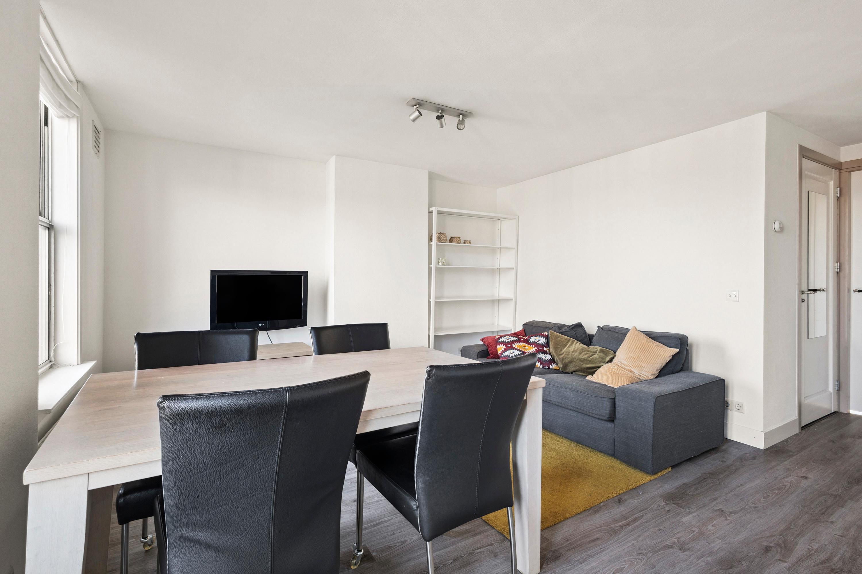 Via de ruime entree en het verzorgde trappenhuis bereik je de woning op de vierde verdieping. De lichte woonkamer vormt het hart van het appartement en biedt voldoende ruimte voor zowel een comfortabele zithoek als een eethoek. De praktische keuken sluit hier goed op aan.