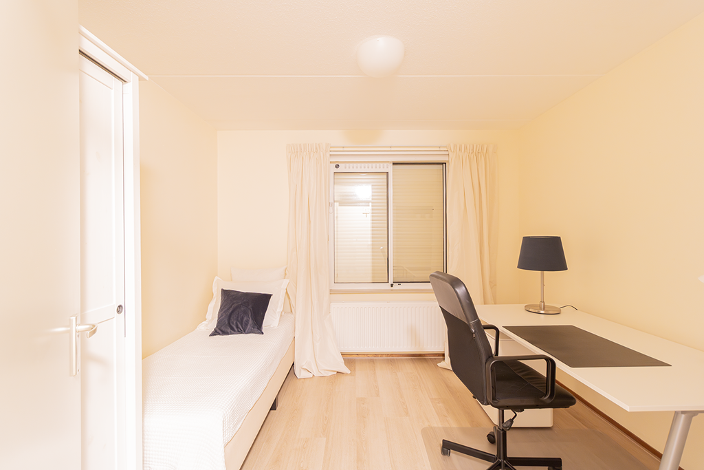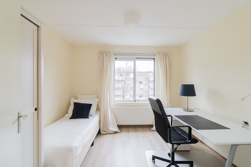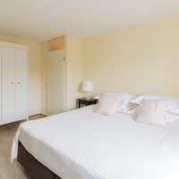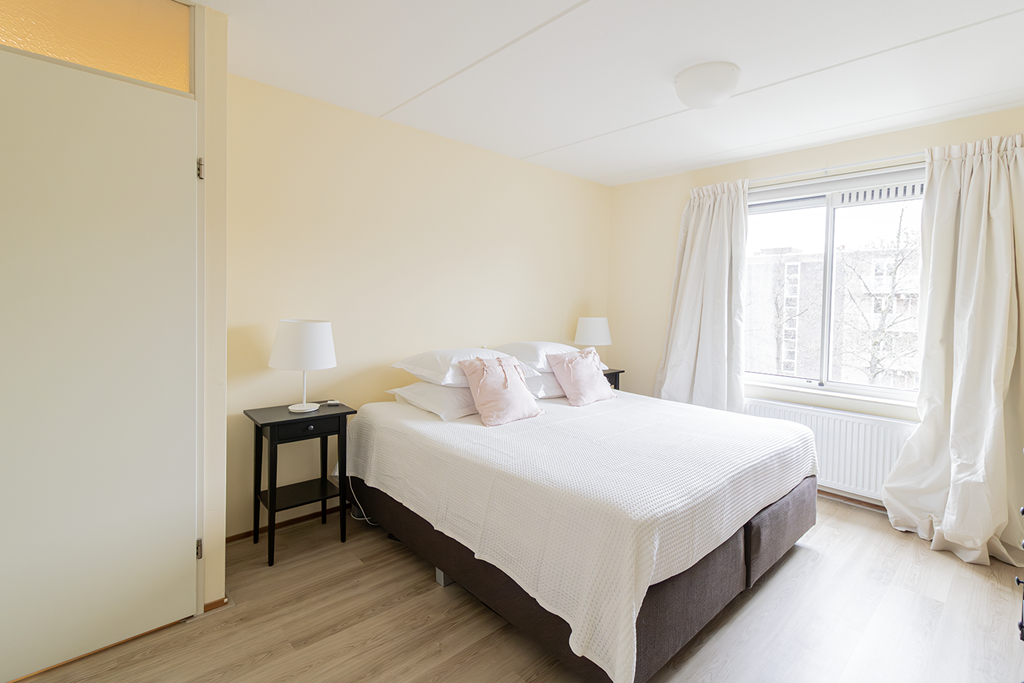 De grote slaapkamer is uitgerust met een tweepersoonsbed en kledingkast. De tweede slaapkamer beschikt over een eenpersoonsbed, bureau met bureaustoel, een hangkast en een boekenkast. Het toilet is gesitueerd op de gang. De badkamer is voorzien van een ligbad, wastafel en inloopdouche. Op de begane grond is een aparte berging beschikbaar, geschikt voor het eventueel stallen van fietsen.