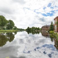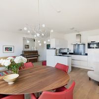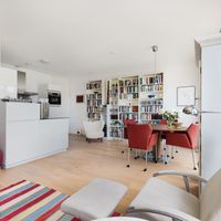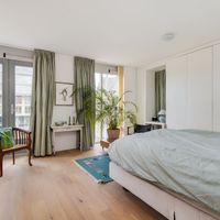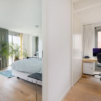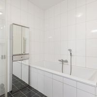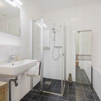 Badkamer met ligbad, aparte douche en wastafel. Woonkamer met grote raampartijen tot de vloer, wat zeer ruimtelijk en licht oogt. De ruimte beschikt over Franse balkons, waardoor in de zomer buiten naar binnen gehaald kan worden.