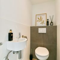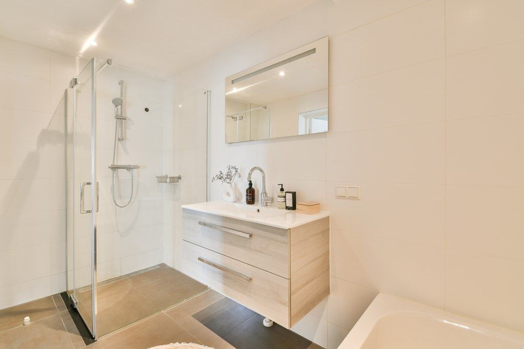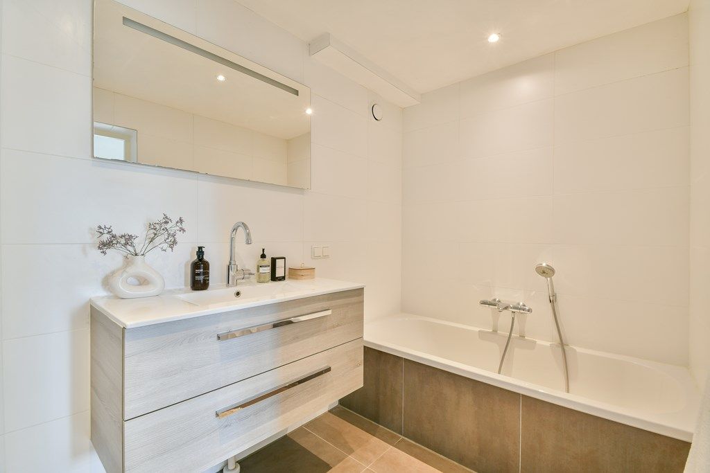 De badkamer is modern afgewerkt, voorzien van een inloopdouche, ligbad en wastafel met wastafelmeubel. Het toilet is separaat en in dezelfde stijlvolle afwerking uitgevoerd.
