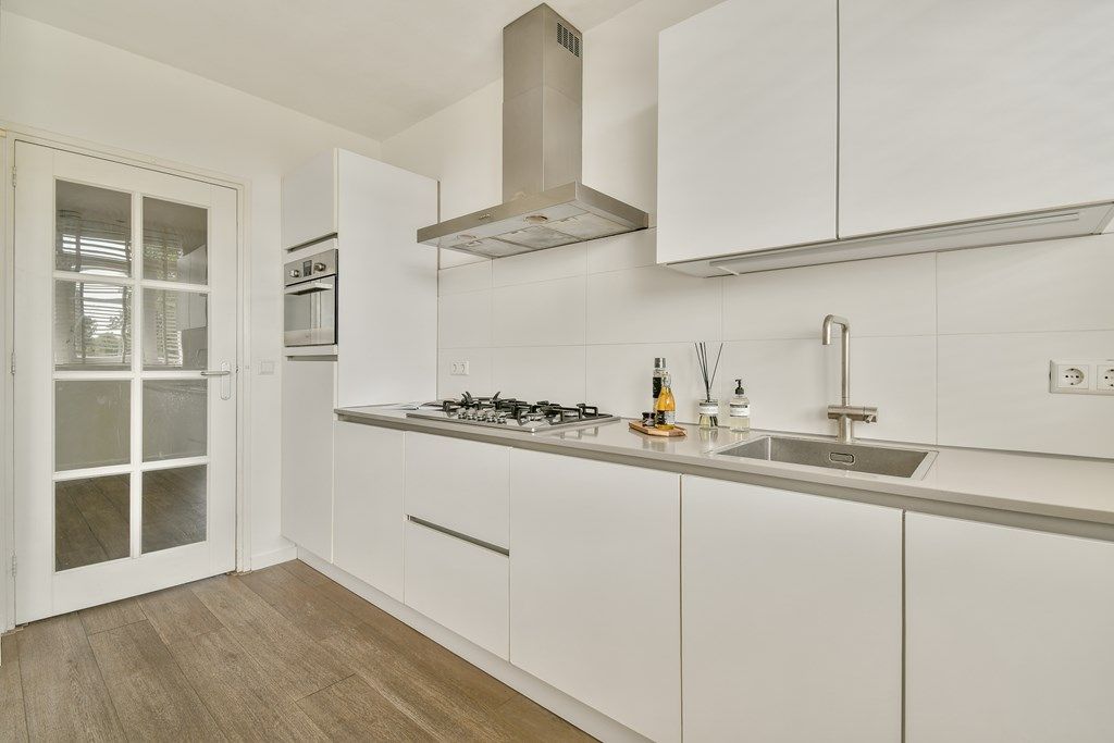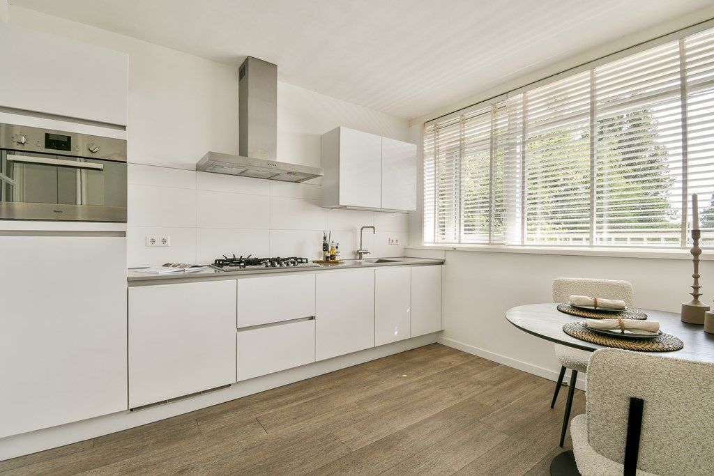 De moderne keuken is praktisch ingericht en voorzien van alle benodigde inbouwapparatuur. Dankzij de efficiënte indeling heb je volop werk- en kastruimte, waardoor koken hier een plezier is. In een op maat gemaakte kast zijn de wasmachine en droger netjes weggewerkt.