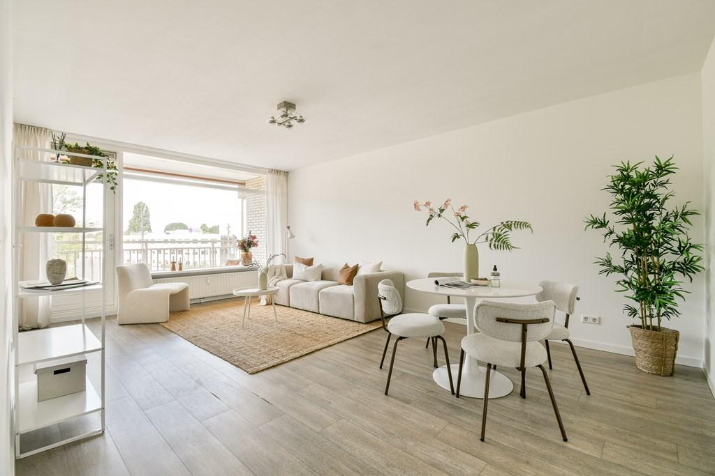De ruime en lichte woonkamer vormt het hart van de woning. Dankzij de grote raampartijen valt het daglicht hier royaal naar binnen en heb je een prettig vrij uitzicht. Via de deur in de woonkamer stap je het royale balkon van 10 m² op, gelegen op het oosten: ideaal voor een ontbijtje in de zon. Het balkon aan de voorzijde is gelegen op het westen en dat is perfect voor een borrel met vrienden of een ontspannen moment aan het einde van de dag. Hier geniet je in alle rust van het buitenleven, zonder de drukte van de stad.