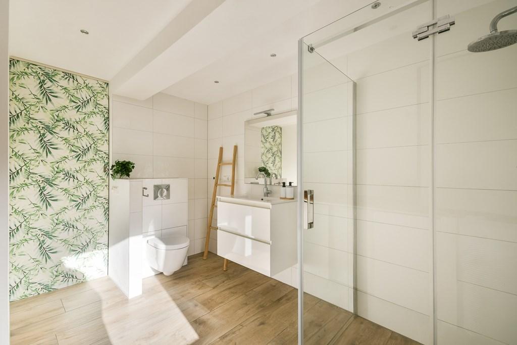 Via de trap naar beneden kom je terecht op de begane grond, hier bevindt zich de badkamer, uitgerust met vloerverwarming met eigen thermostaat (2018) een inloopdouche, een sanibroyeur toilet, een wastafel met meubel en aansluitingen voor zowel wasmachine als droger. Ook bevindt zich hier de ruime masterbedroom, rustig gelegen en ideaal als comfortabele hoofdslaapkamer, voorzien van een ruime ingebouwde kast.
