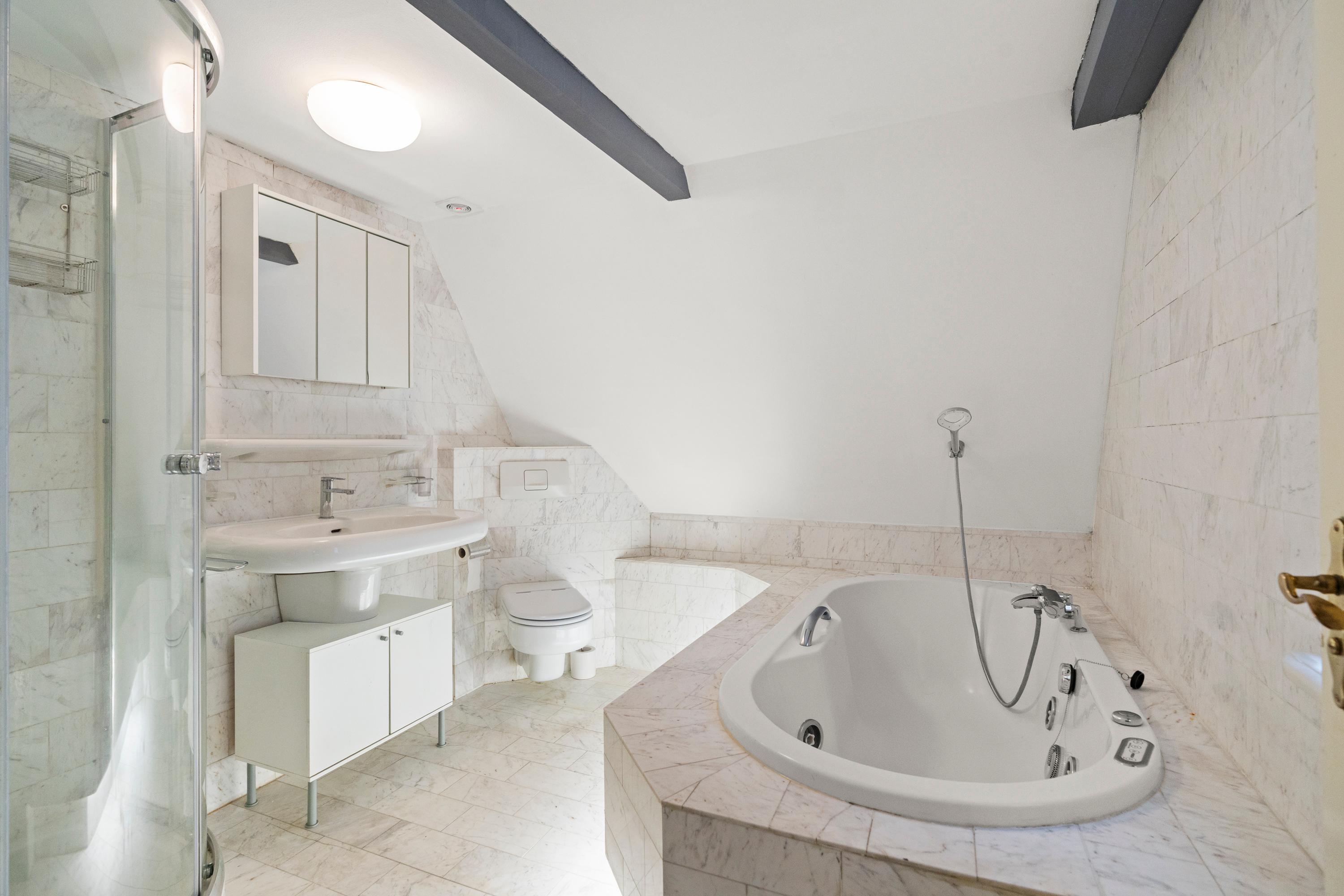 De bovenste verdieping beschikt over een ruime slaapkamer en een nette badkamer, uitgerust met een ligbad, douchecabine en toilet. Daarnaast is er op deze verdieping voldoende bergruimte aanwezig.