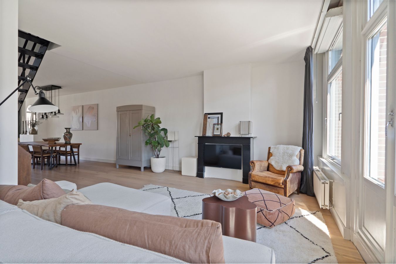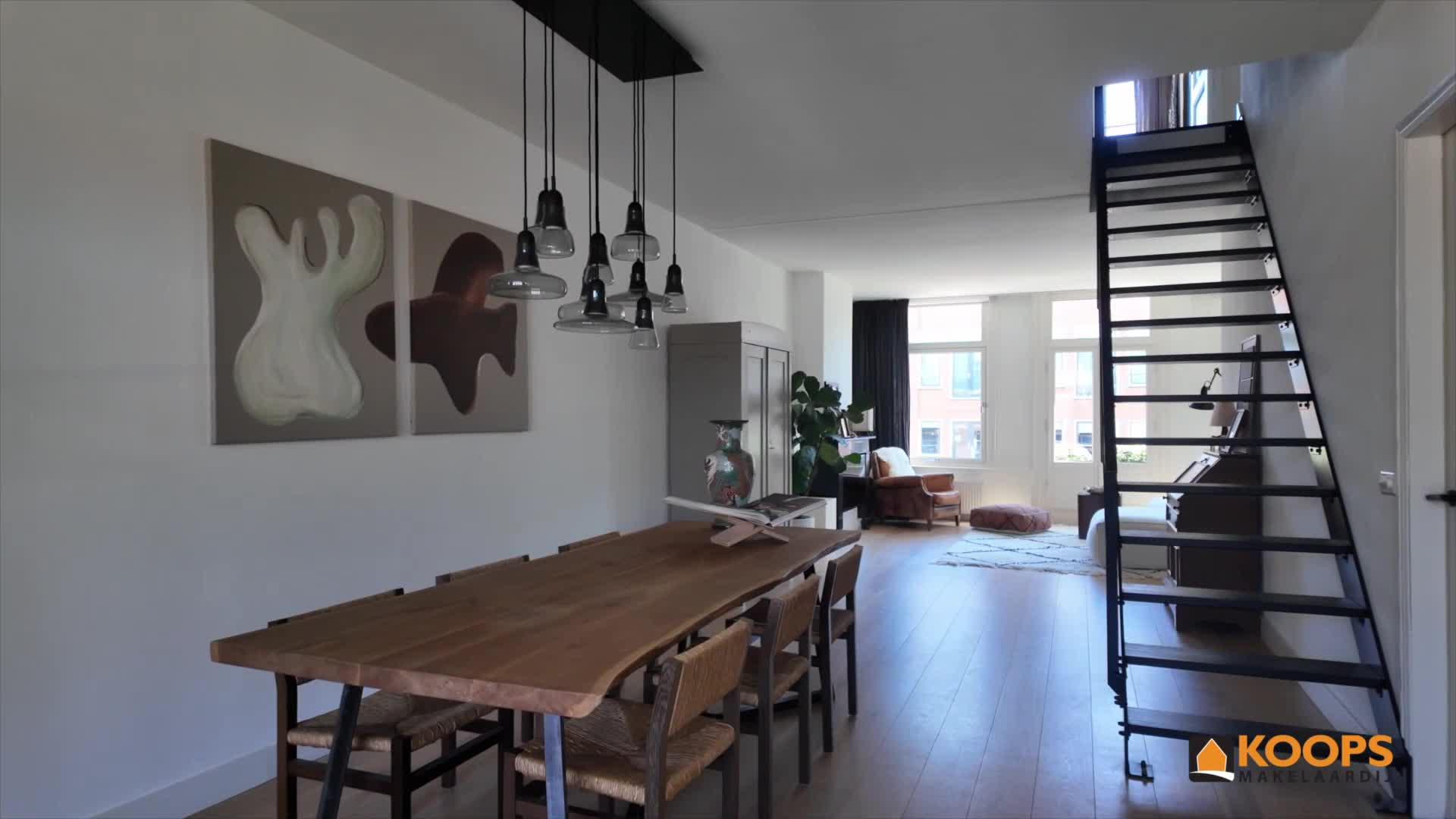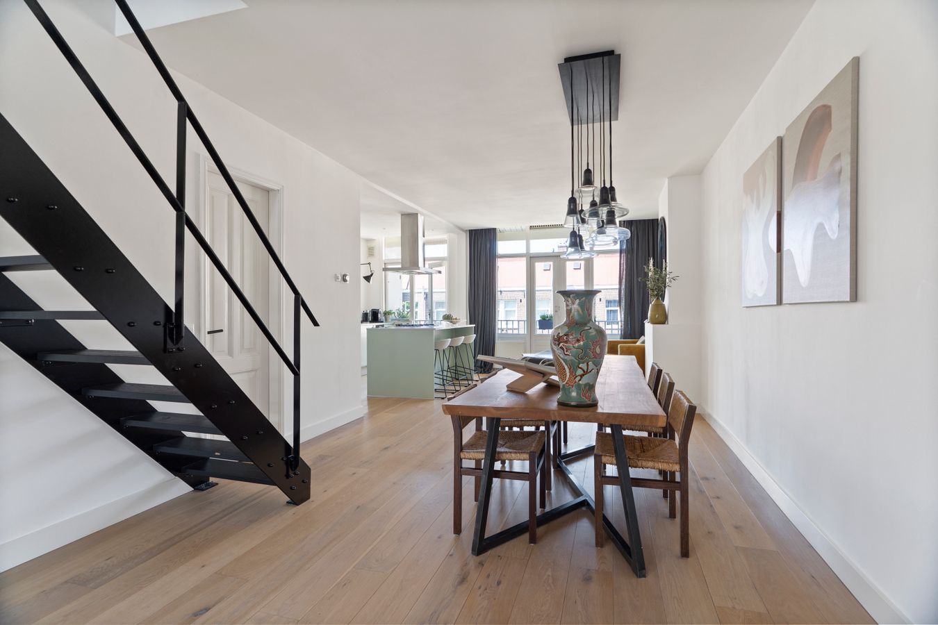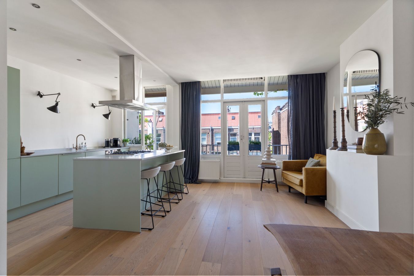 Bij binnenkomst valt direct de lichte en sfeervolle doorzonkamer op, voorzien van een houten vloer, hoge plafonds en grote raampartijen met openslaande deuren naar balkons aan weerszijden. Dit zorgt voor een prachtige lichtinval en een aangenaam binnen-buitengevoel. De woonruimte is ingericht met een gezellige zithoek rond een klassieke schouw en loopt door naar een royale eethoek met open keuken. De moderne keuken is uitgerust met een kookeiland, vaatwasser, combi-oven, koel-vriescombinatie en veel opbergruimte. Aan de achterzijde bereik je middels de openslaande deuren een heerlijk balkon.
