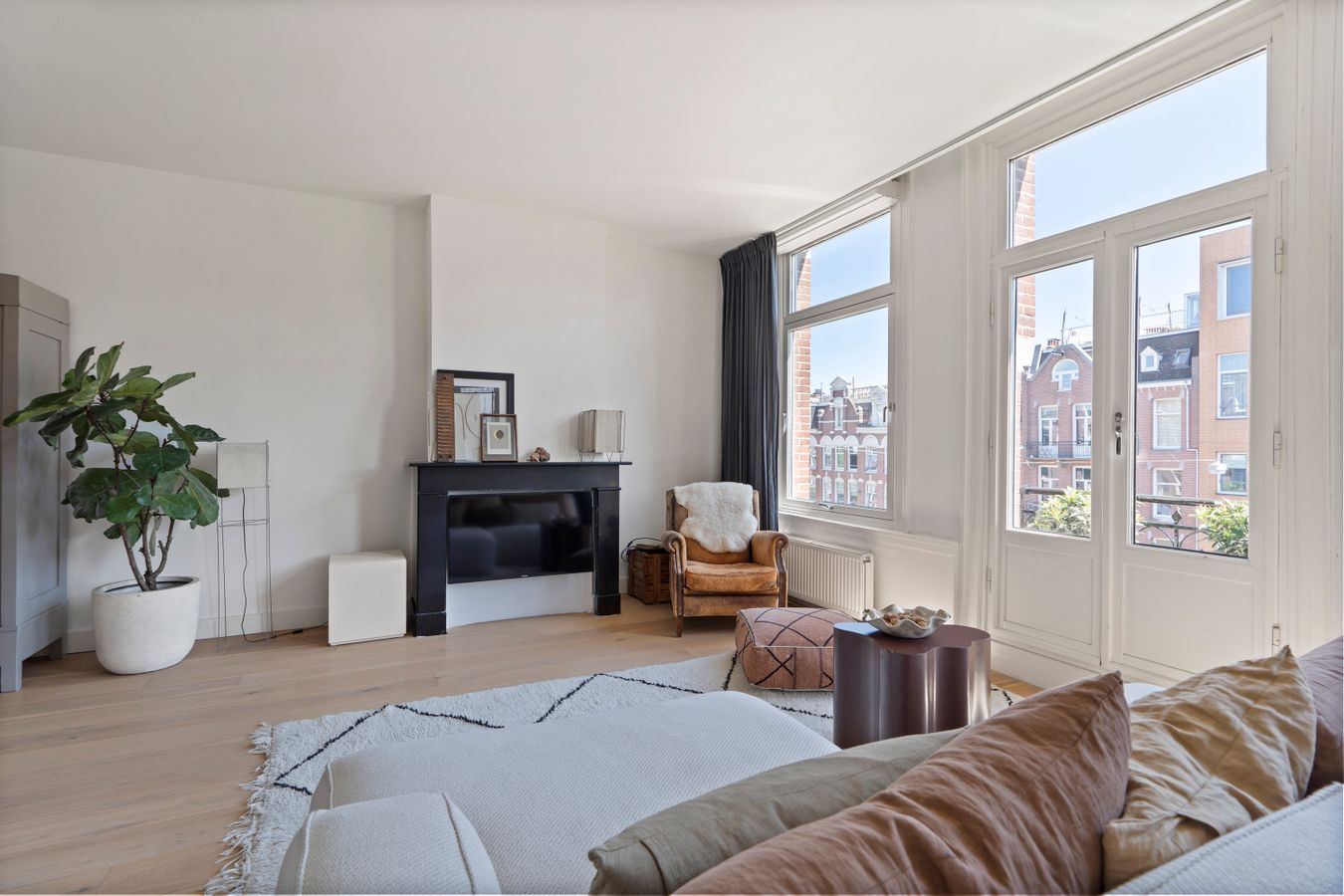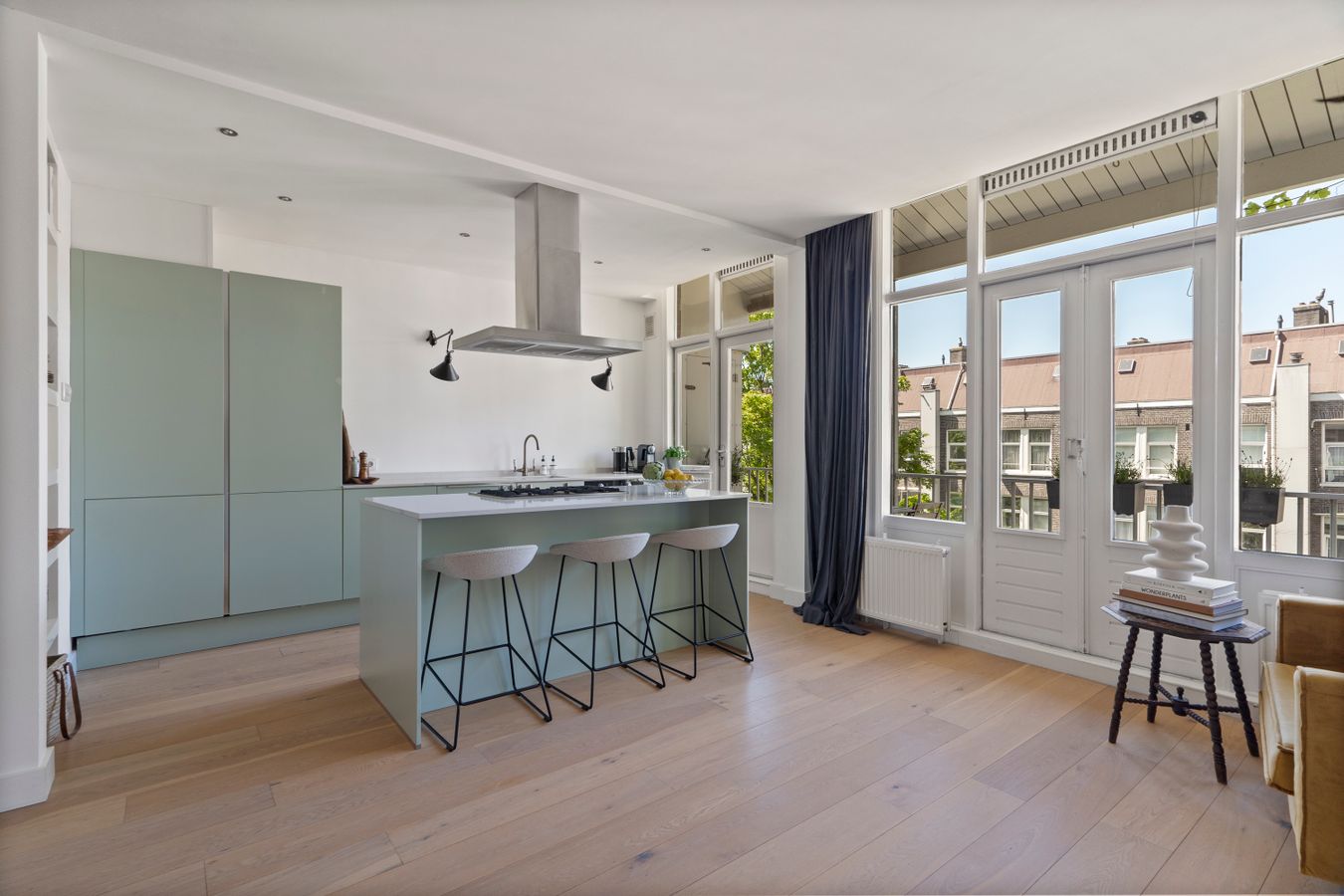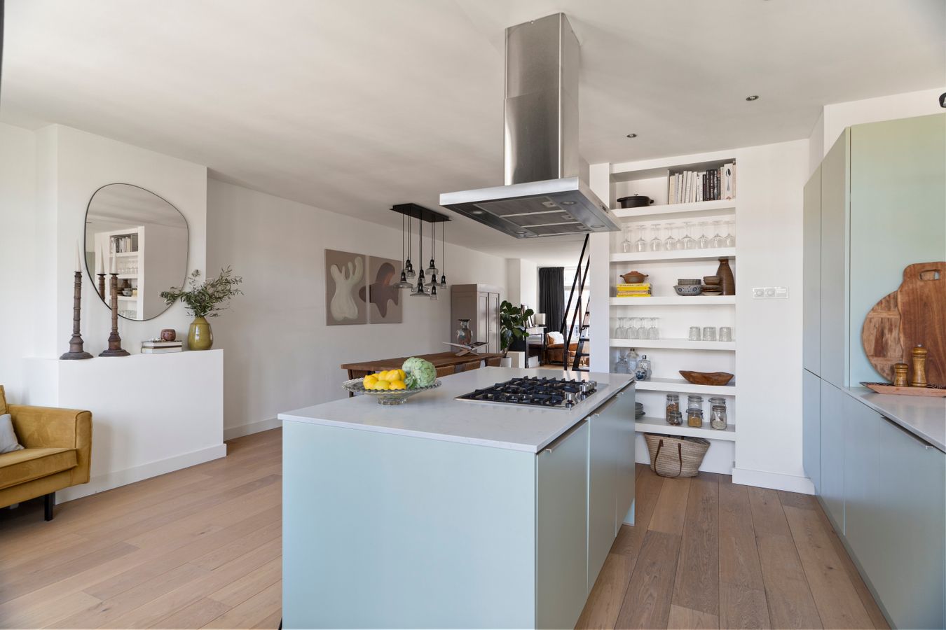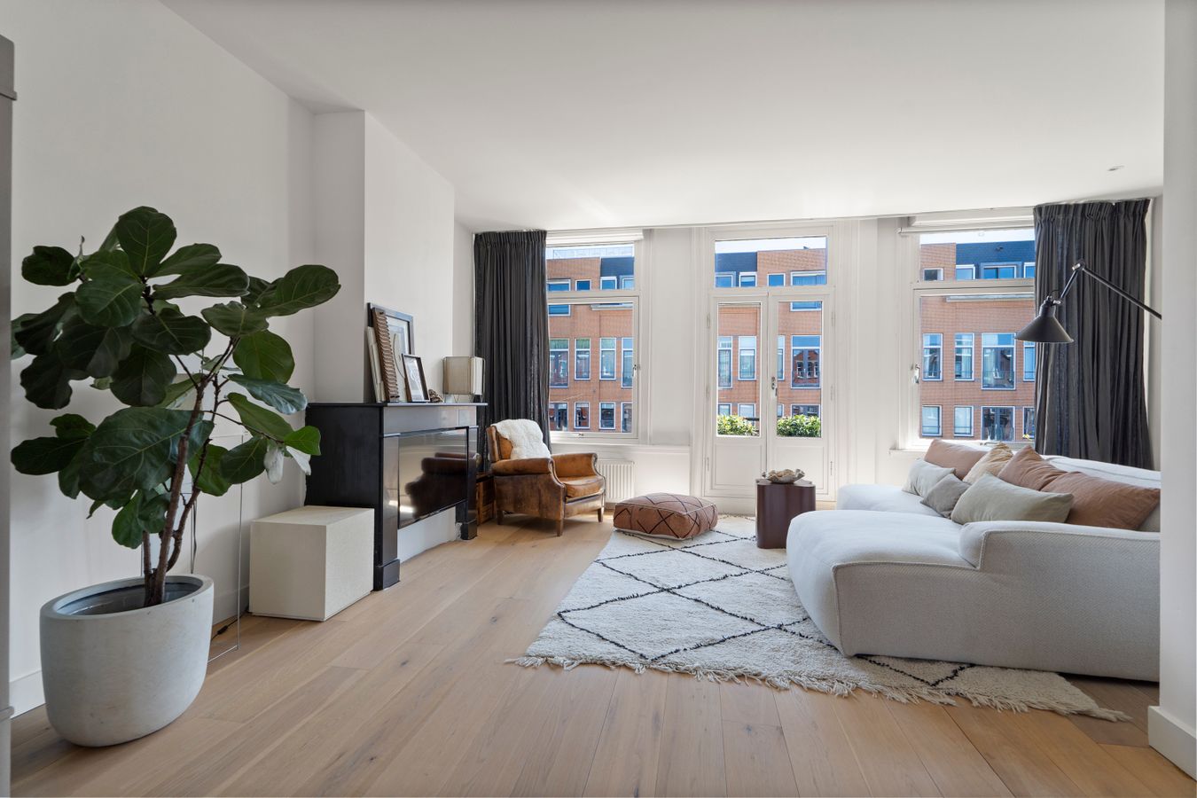 Bij binnenkomst valt direct de lichte en sfeervolle doorzonkamer op, voorzien van een houten vloer, hoge plafonds en grote raampartijen met openslaande deuren naar balkons aan weerszijden. Dit zorgt voor een prachtige lichtinval en een aangenaam binnen-buitengevoel. De woonruimte is ingericht met een gezellige zithoek rond een klassieke schouw en loopt door naar een royale eethoek met open keuken. De moderne keuken is uitgerust met een kookeiland, vaatwasser, combi-oven, koel-vriescombinatie en veel opbergruimte. Aan de achterzijde bereik je middels de openslaande deuren een heerlijk balkon.