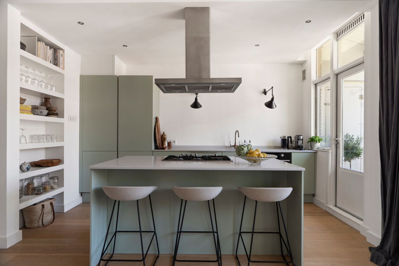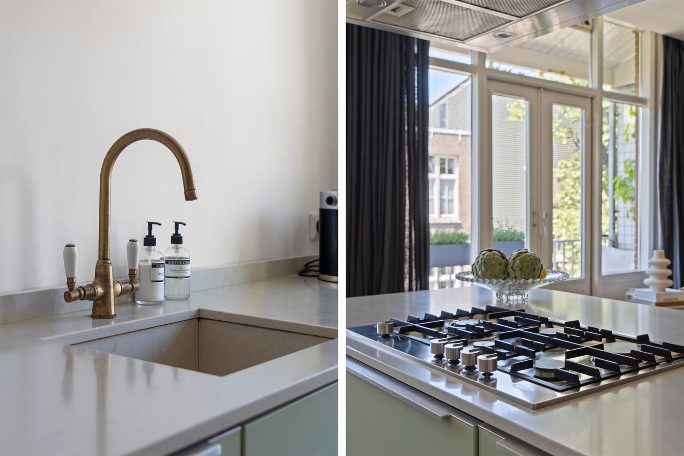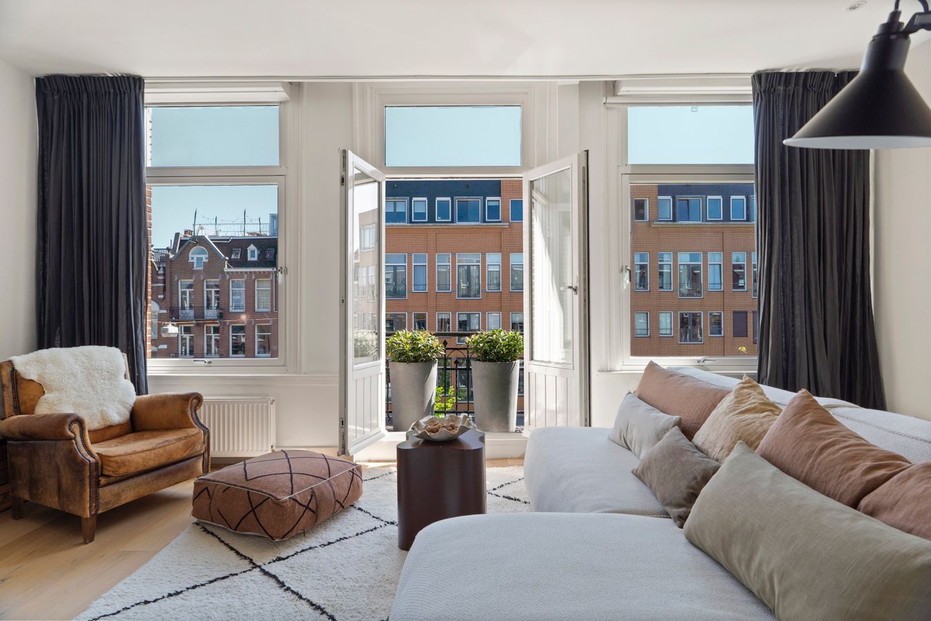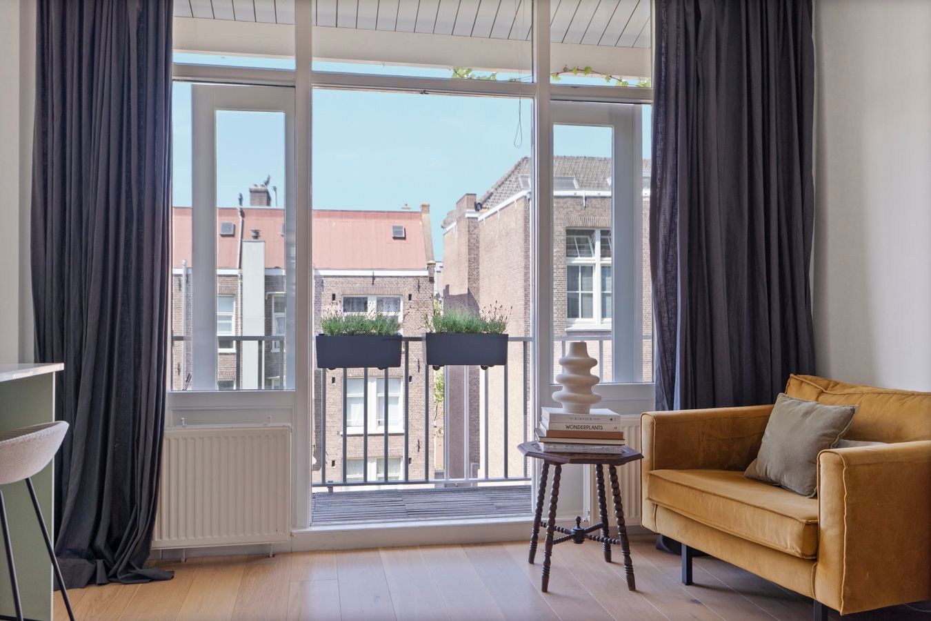 Bij binnenkomst valt direct de lichte en sfeervolle doorzonkamer op, voorzien van een houten vloer, hoge plafonds en grote raampartijen met openslaande deuren naar balkons aan weerszijden. Dit zorgt voor een prachtige lichtinval en een aangenaam binnen-buitengevoel. De woonruimte is ingericht met een gezellige zithoek rond een klassieke schouw en loopt door naar een royale eethoek met open keuken. De moderne keuken is uitgerust met een kookeiland, vaatwasser, combi-oven, koel-vriescombinatie en veel opbergruimte. Aan de achterzijde bereik je middels de openslaande deuren een heerlijk balkon.
