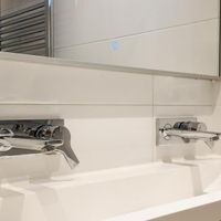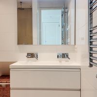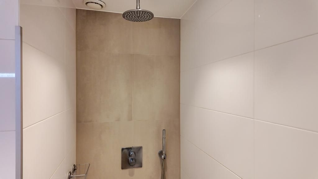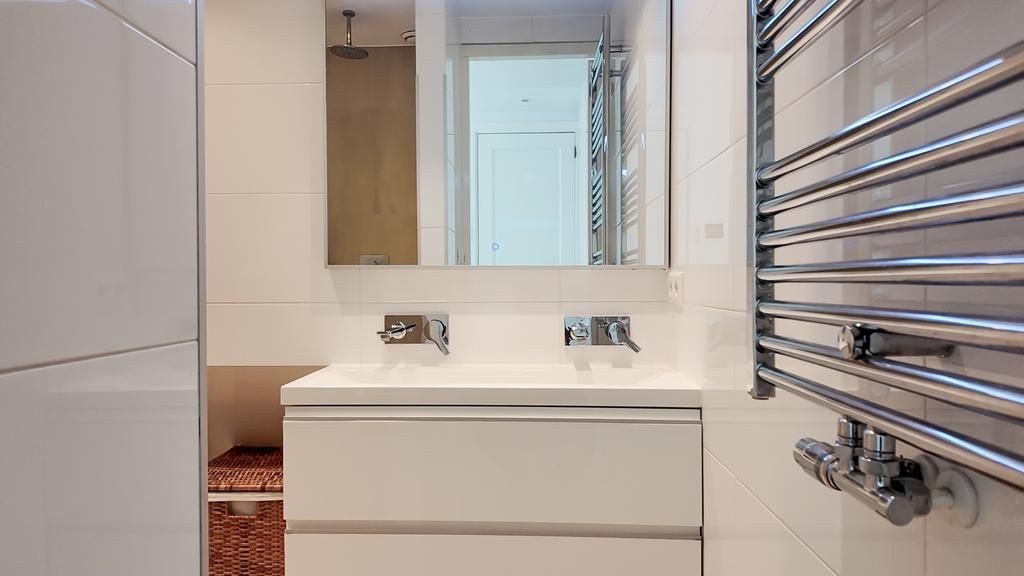 De strak afgewerkte badkamer met regendouche is handig gesitueerd in het midden van de woning. Een grote dubbele wastafel met verlichte spiegel zorgt voor een makkelijke dagelijkse badkamer routine en een ruim badkamermeubel verzorgt genoeg opbergruimte voor iedereen. Het toilet is separaat en heeft zijn eigen fonteintje.