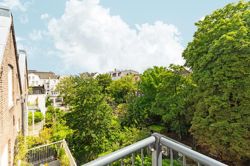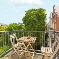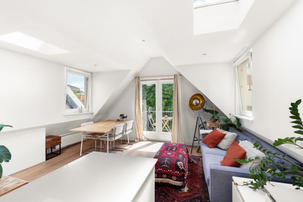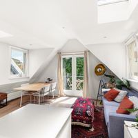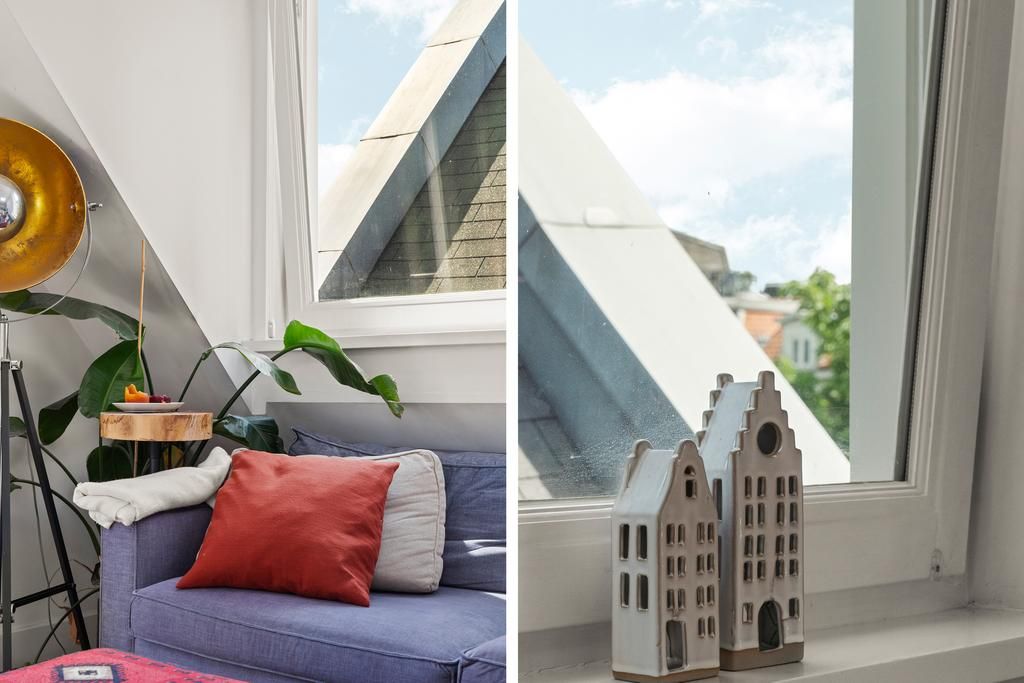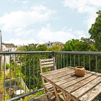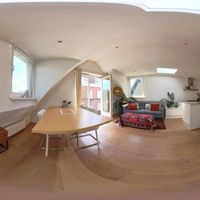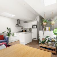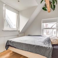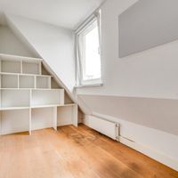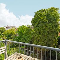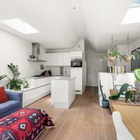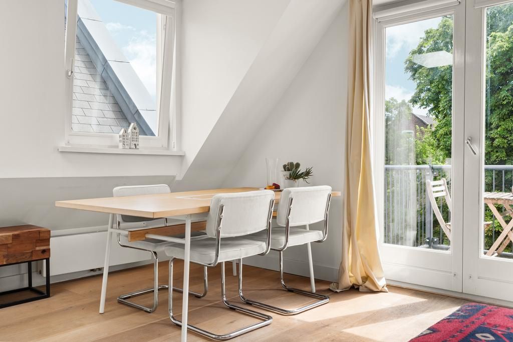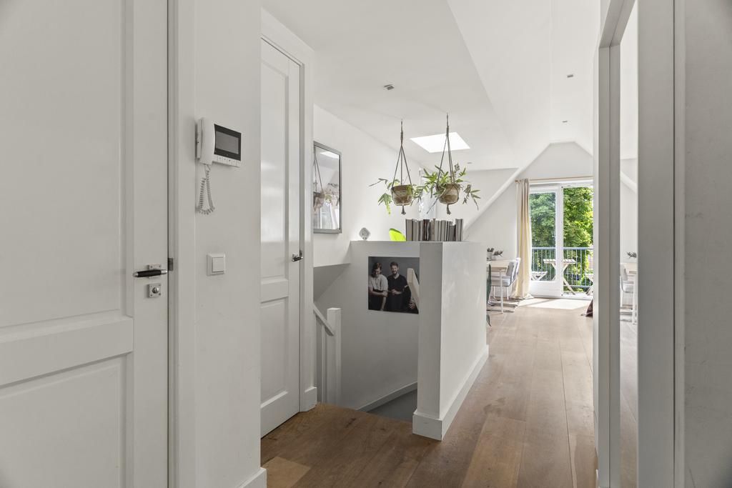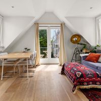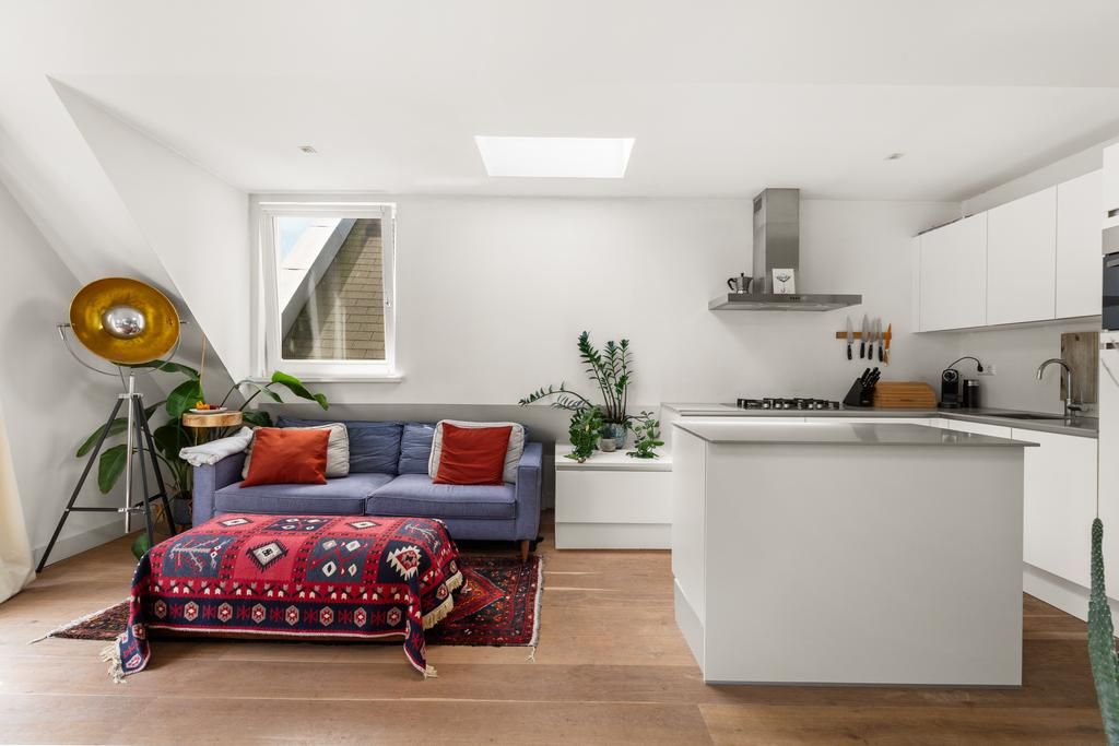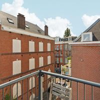 De woonkamer met aangrenzende open keuken is door de vele velux ramen zon overgoten. Daarnaast loop je vanuit de woonkamer zo het balkon op. Het balkon is gelegen aan de achterzijde van de woning met prachtig uitzicht over de binnentuinen van de Govert Flinckstraat. De ligging van het balkon zorgt ervoor dat u de hele dag in privacy van de zon kan genieten.