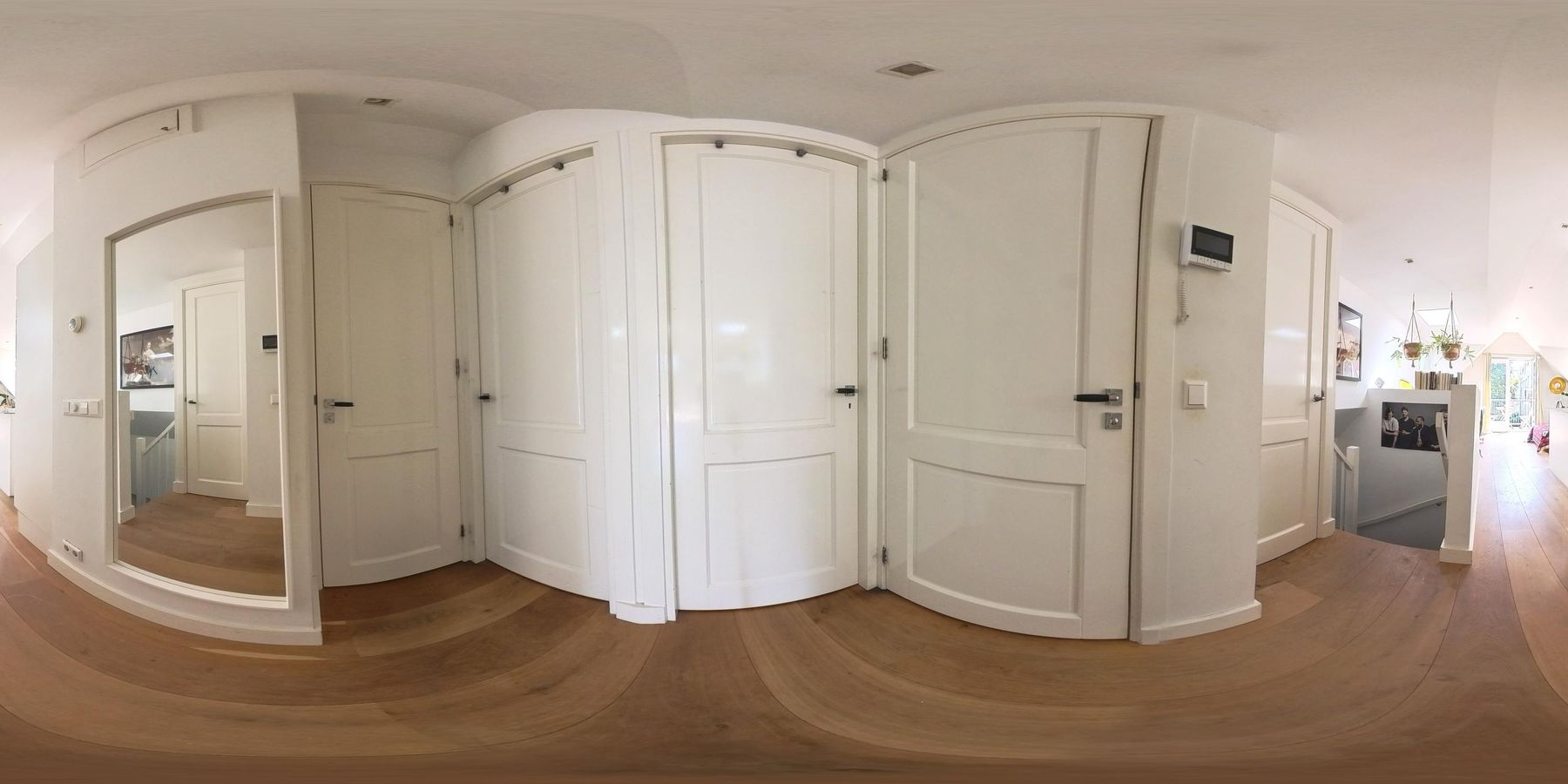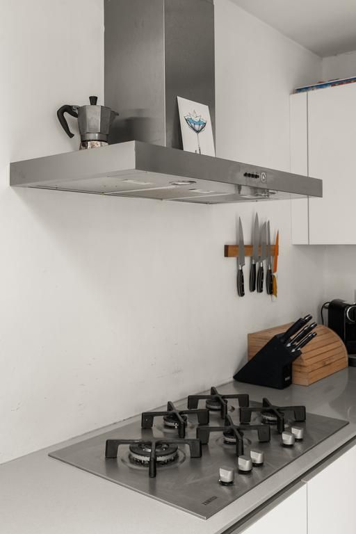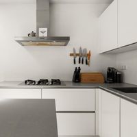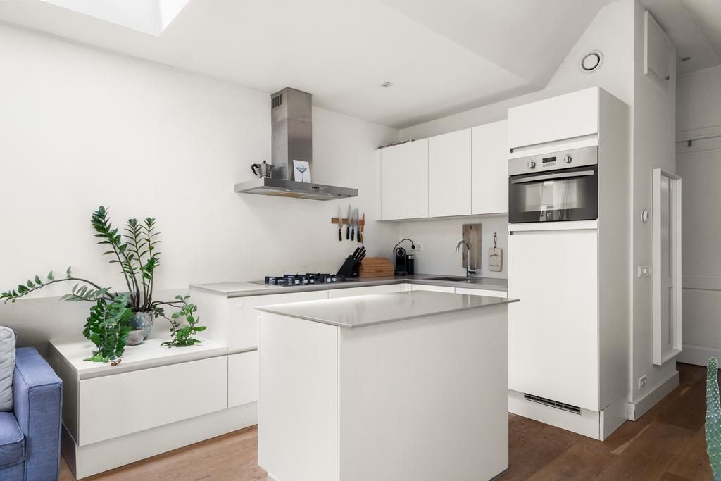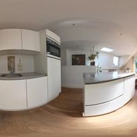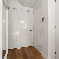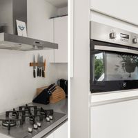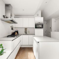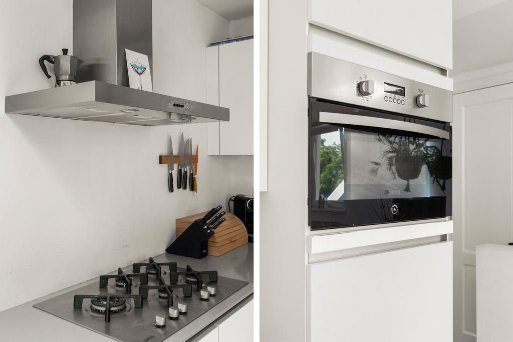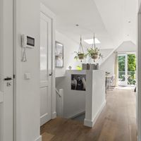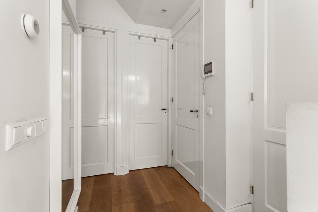De voordeur van het appartement bevindt zich op de tweede verdieping. De overloop is voorzien van een handige kast waar de jassen kunnen worden opgehangen. Na de laatste trap loop u de grote open woonkeuken.