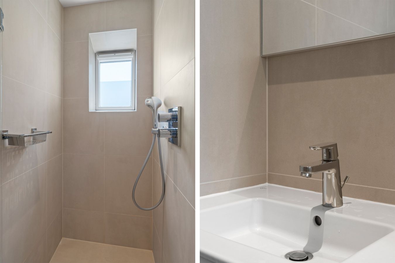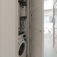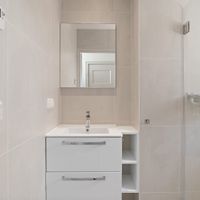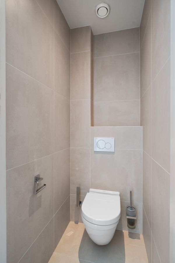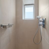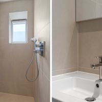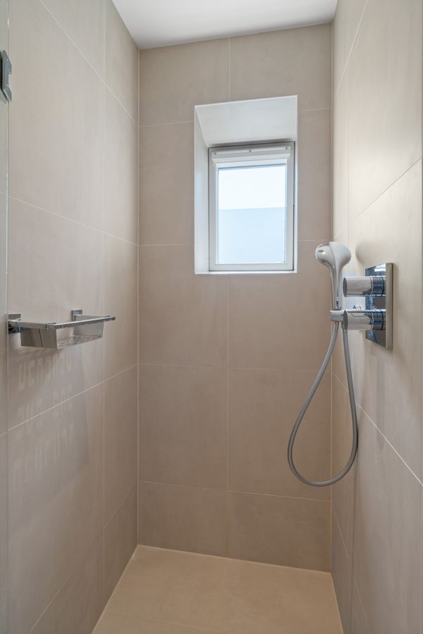 De moderne badkamer is voorzien van een ruime inloopdouche en een spiegelkast. Het toilet is separaat gelegen. Bovendien is er een ruimte waar de was-droogcombinatie staat, welke in 2024 zijn aangeschaft.