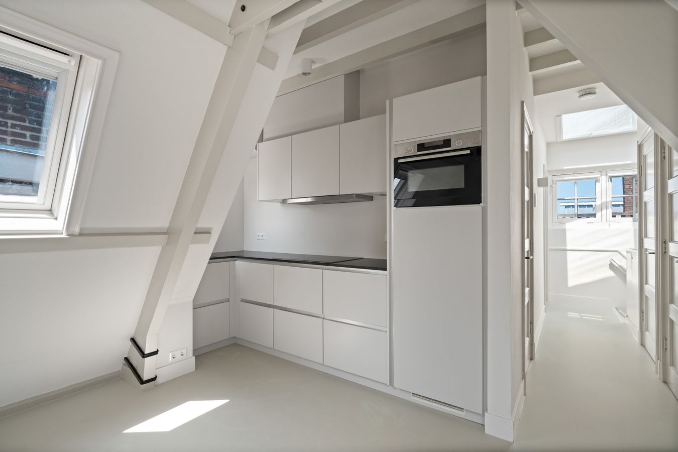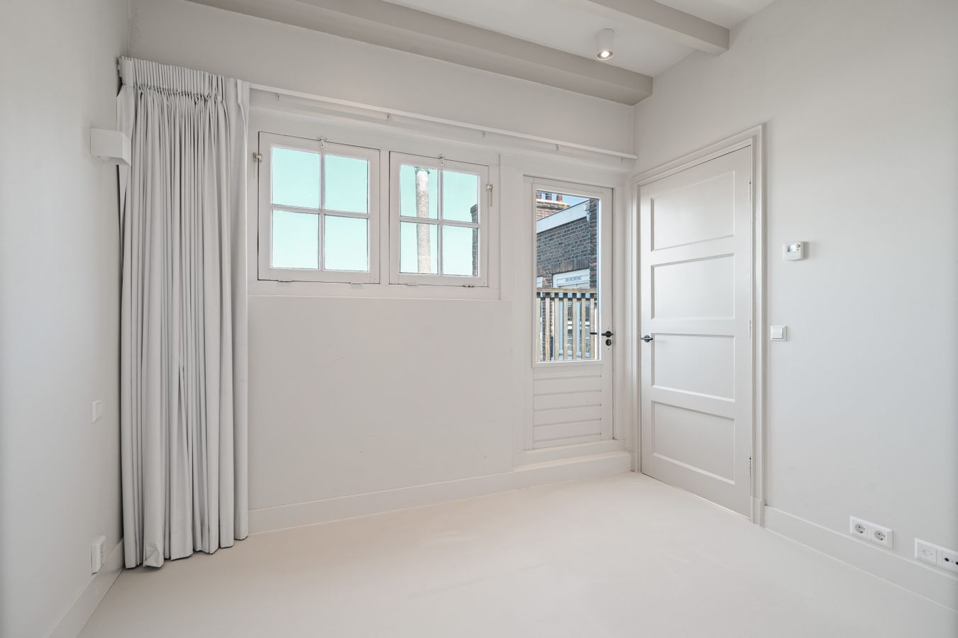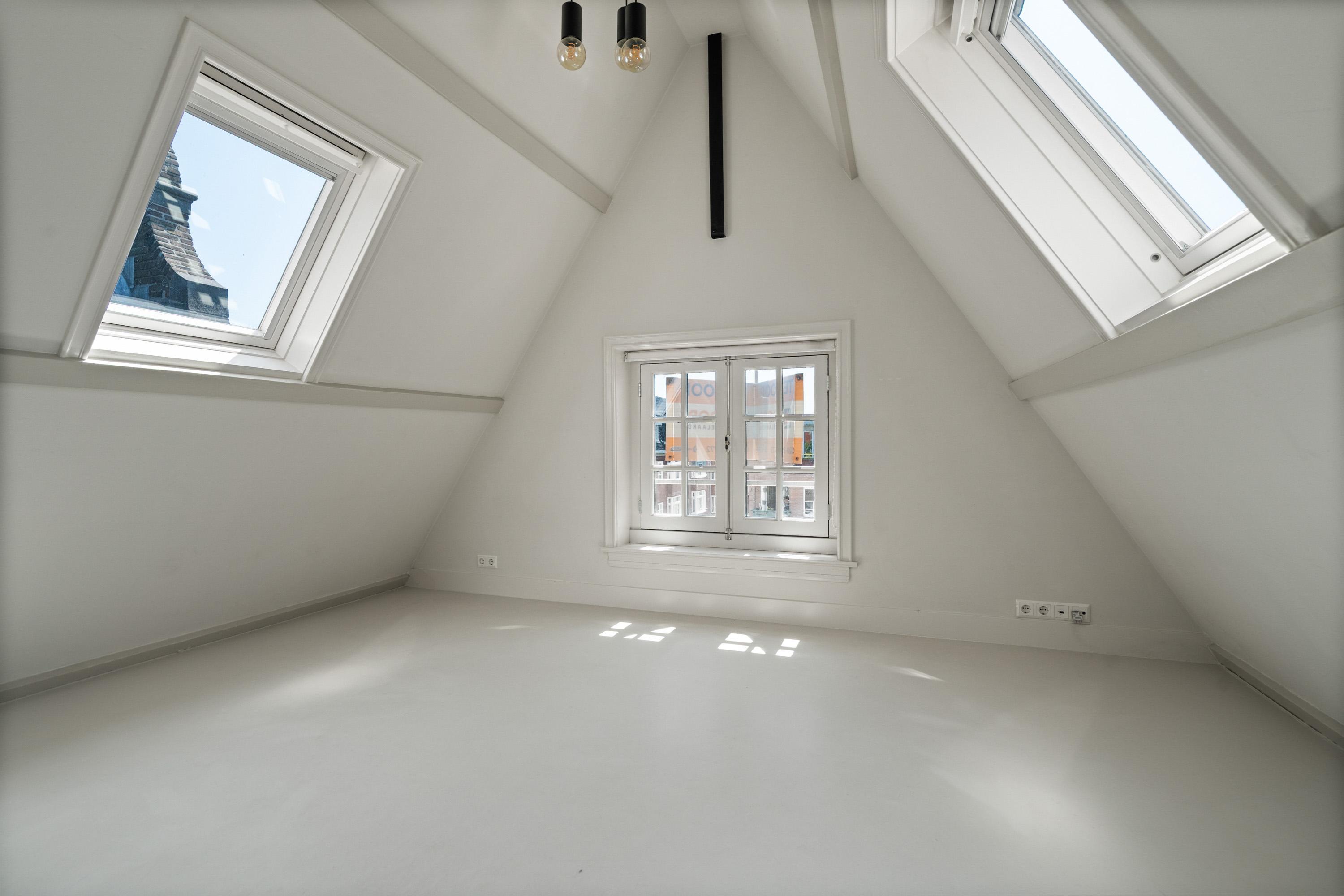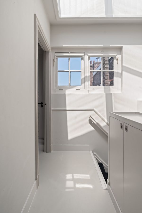Aan de achterzijde van de woning ligt de slaapkamer, die net zoals de rest van de woning veel natuurlijk licht binnenlaat. Vanuit de slaapkamer is er toegang tot een rustig, privé dakterras van 11m², gelegen op het noorden.