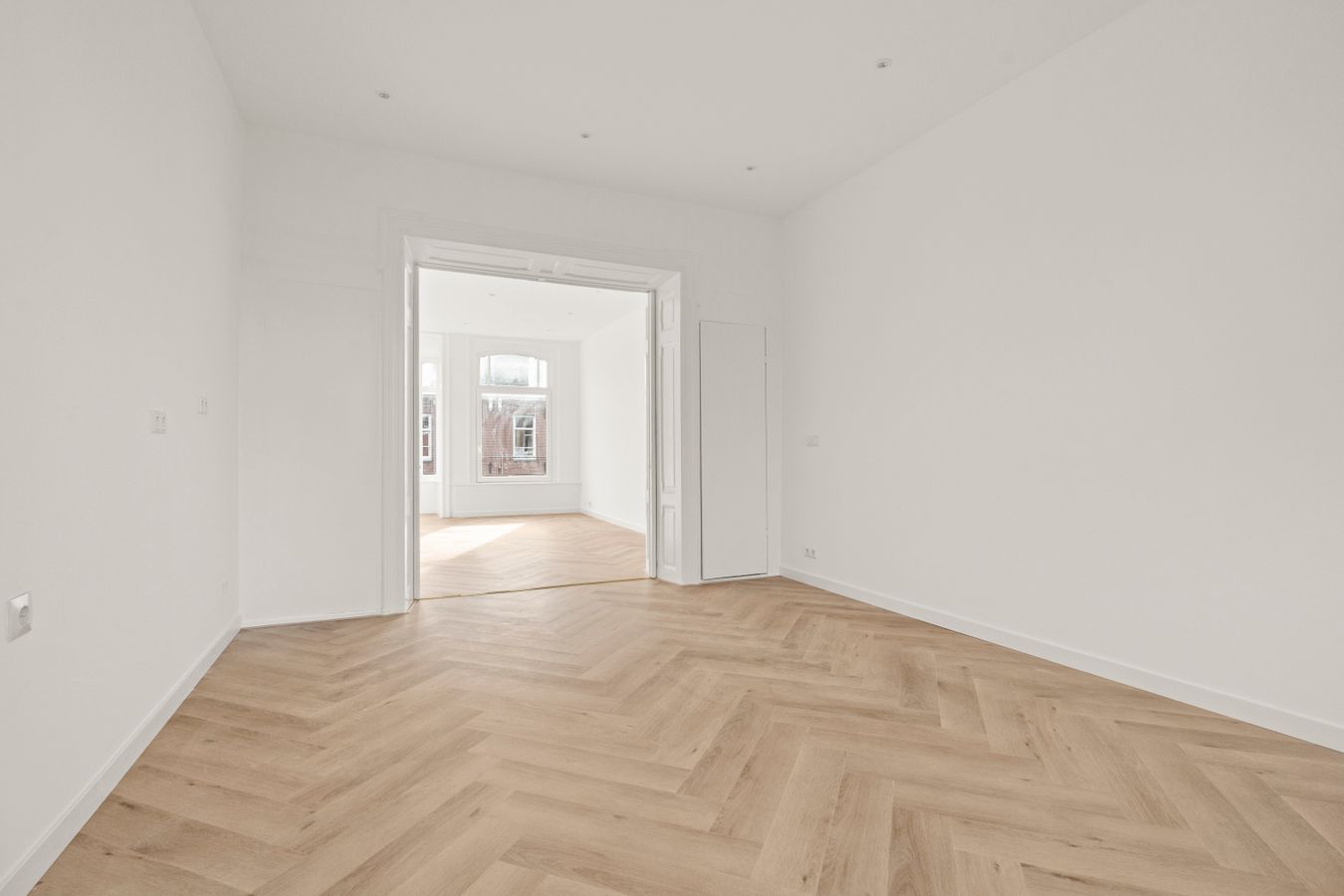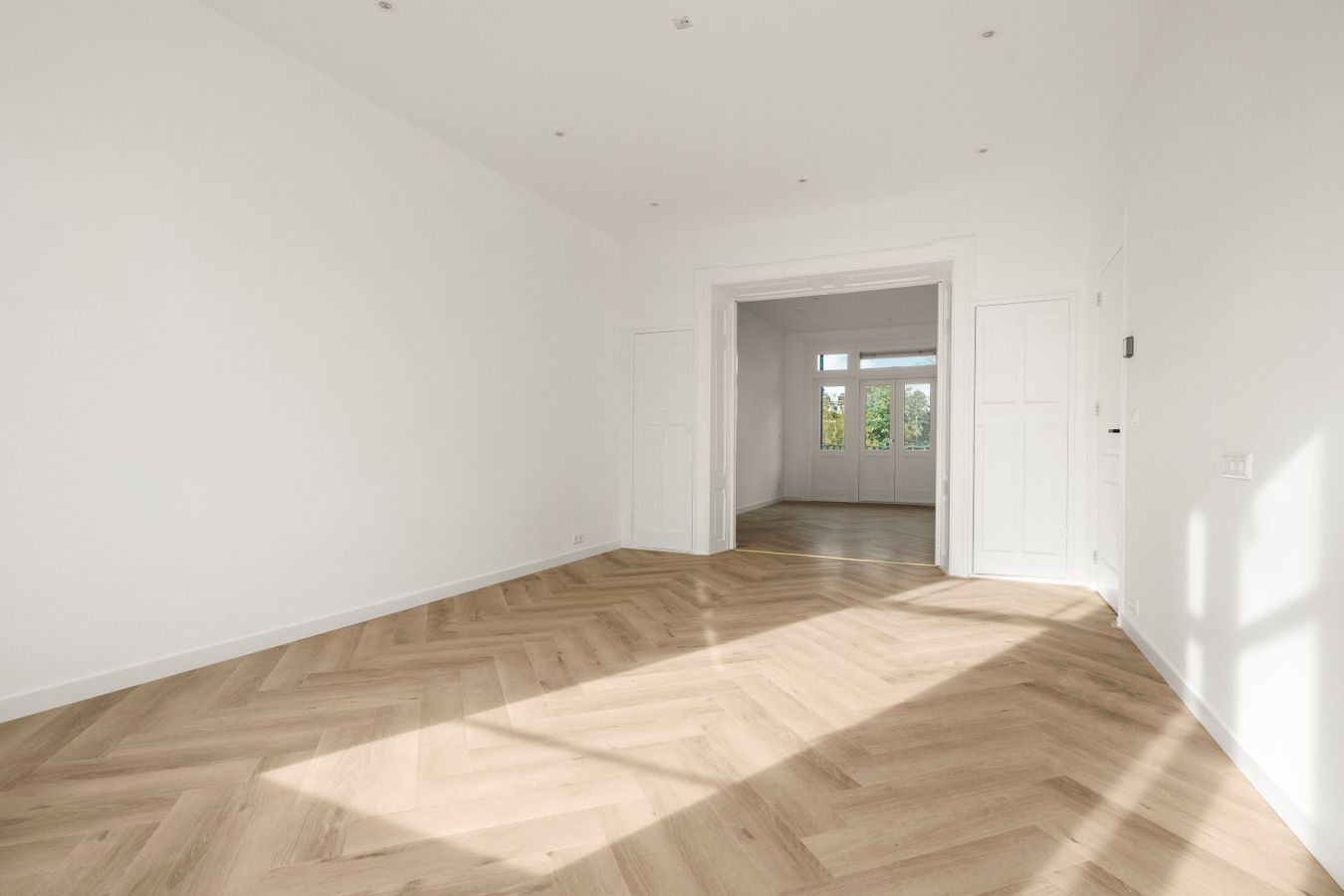 Authentieke en-suite schuifdeuren met ingebouwde kasten geven het een echt klassiek Amsterdams karakter. Met de schuifdeuren kun je de ruimte gemakkelijk opdelen in twee aparte vertrekken voor extra flexibiliteit. De echte eyecatcher is het de visgraatvloer, voorzien van vloerverwarming.