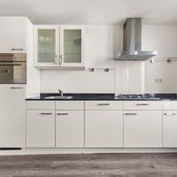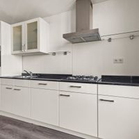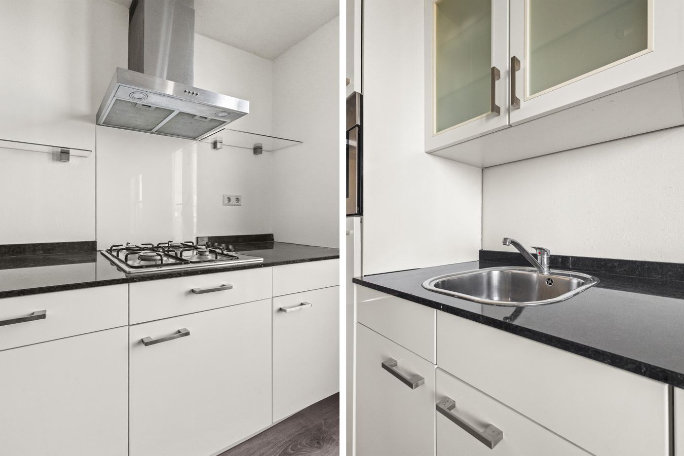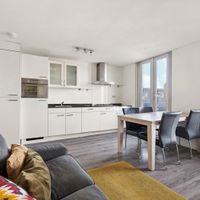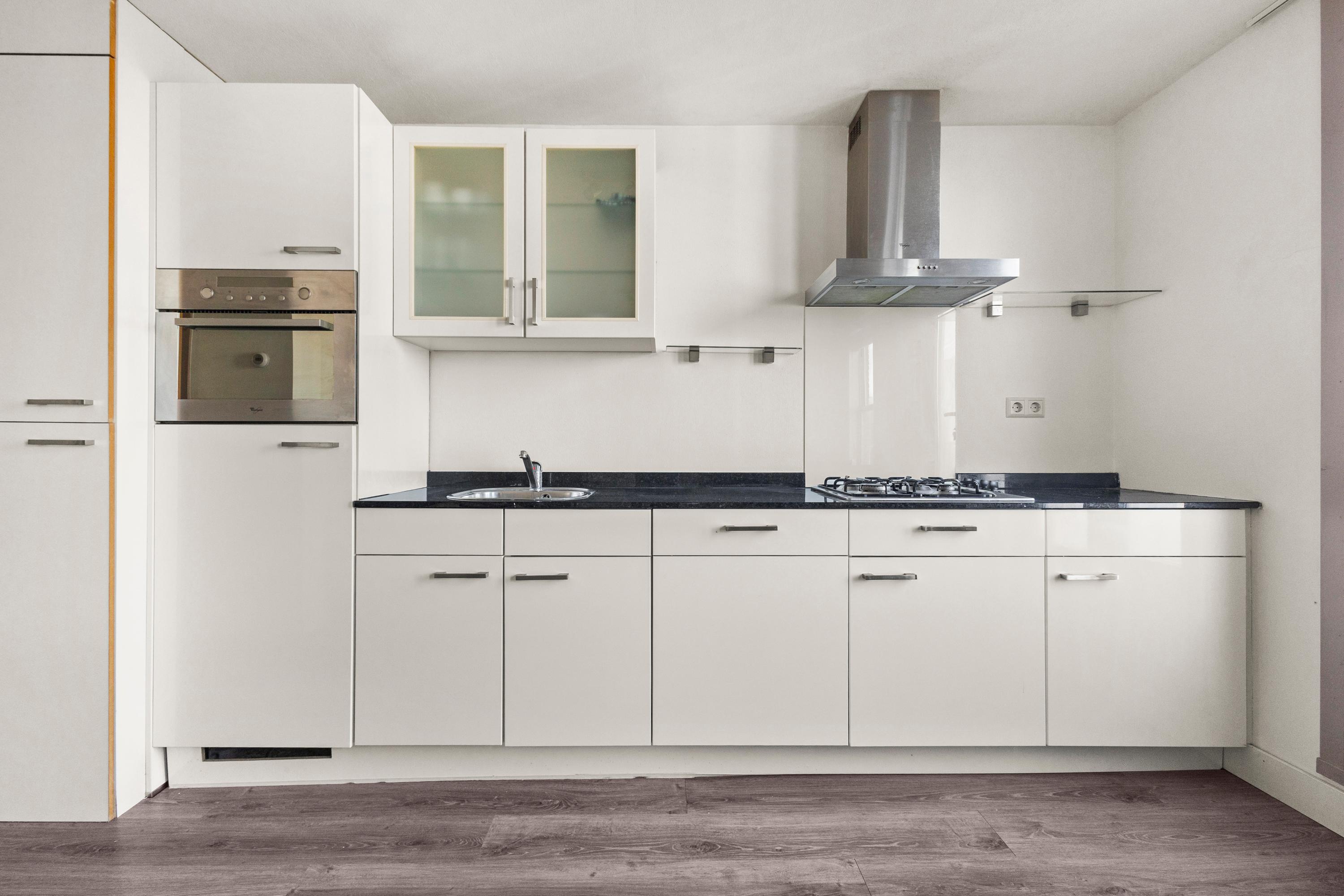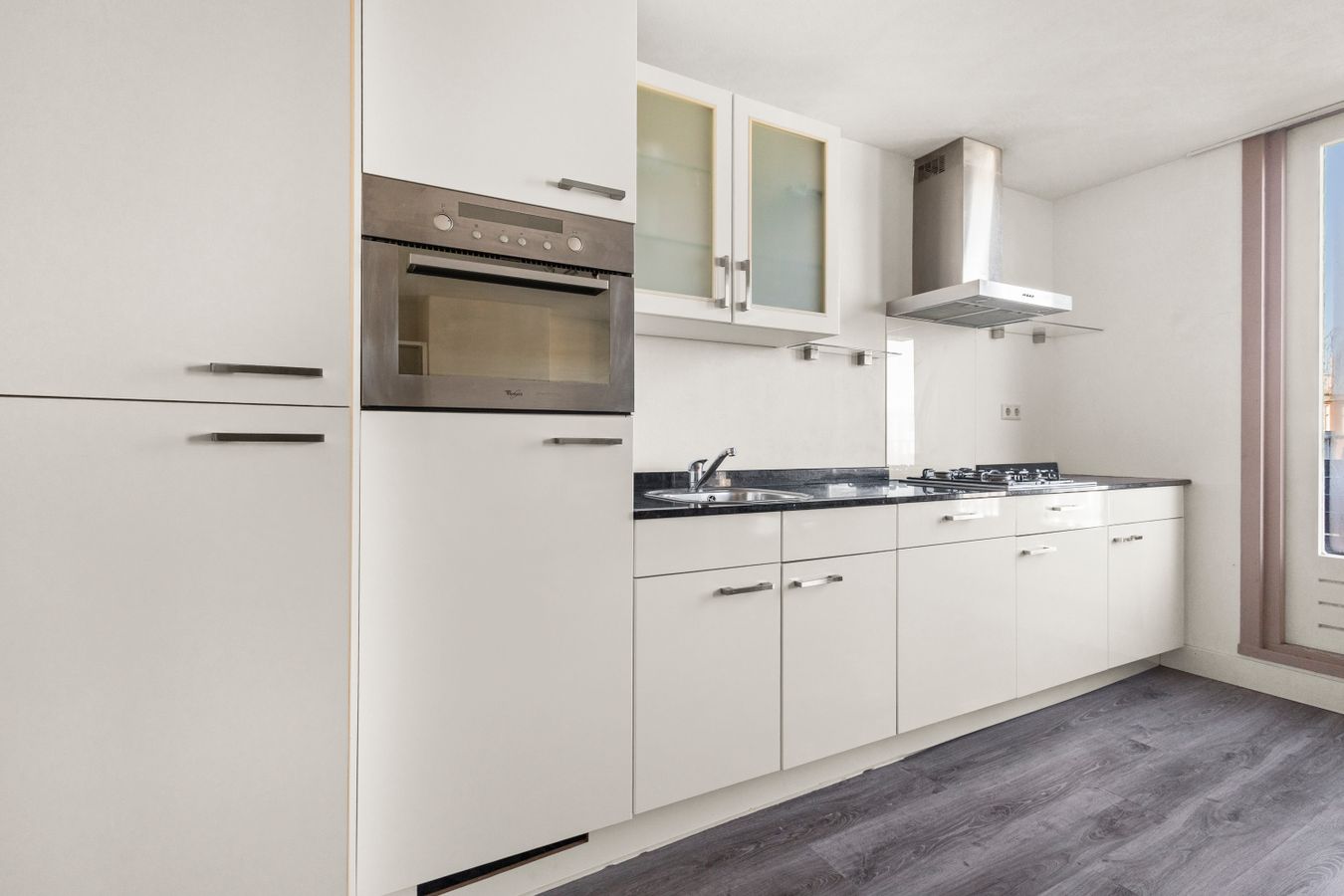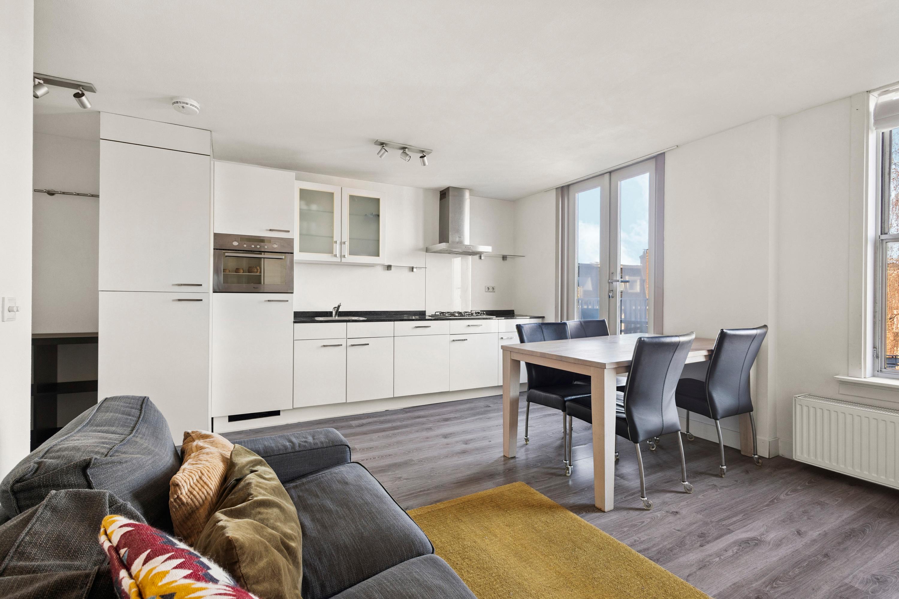 Via de ruime entree en het verzorgde trappenhuis bereik je de woning op de vierde verdieping. De lichte woonkamer vormt het hart van het appartement en biedt voldoende ruimte voor zowel een comfortabele zithoek als een eethoek. De praktische keuken sluit hier goed op aan.