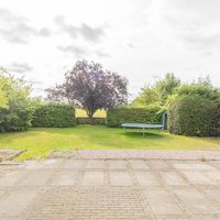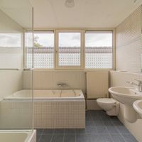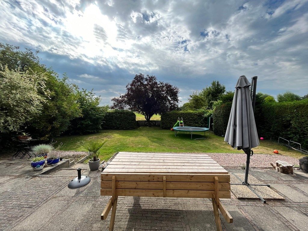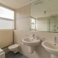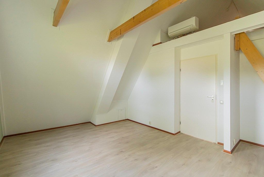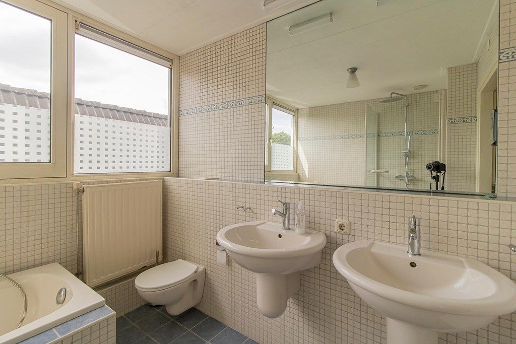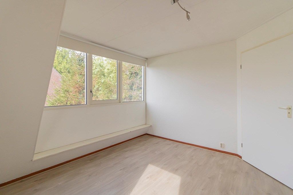 Er zijn twee paar openslaande deuren naar de zonnige achtertuin. Daarnaast is vanuit een bijkeuken met wasmachine-aansluiting de tuin ook toegankelijk. Vanuit de bijkeuken is een studeer- of extra slaapkamer te bereiken en vanuit deze ruimte de garage. De garage is geschikt om een auto in te parkeren. Er bevindt zich hier ook een vlizotrap naar een zeer royale berging welke boven de garage en studeer/slaapkamer zit. Tussen de woonkamer en keuken bevindt zich een open trap naar de eerste verdieping met drie slaapkamers en de badkamer. De moderne badkamer heeft een ligbad, douchecabine, dubbele wastafel en een tweede toilet. De royale ouderslaapkamer zit aan de voorzijde en heeft een trap naar een open bergruimte wat een leuk effect aan de slaapkamer geeft. Aan de achterzijde zijn de tweede en derde slaapkamer te vinden.