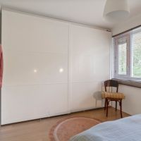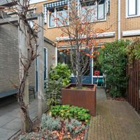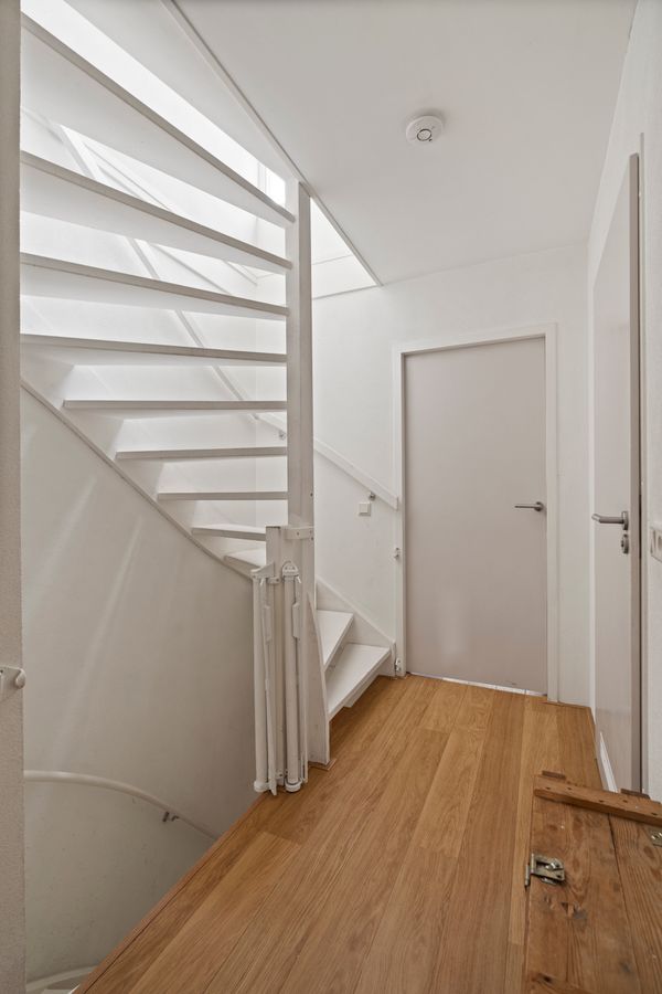 Op de eerste verdieping is een overloop met toegang tot een ruime (ouder)slaapkamer aan de straatzijde en een nette badkamer voorzien van een inloop- regendouche, tweede toilet, dubbele wastafel en een bergkast. Tevens bevindt zich hier een technische ruimte met cv-ketel, wasmachine en droger. Aan de achterzijde zijn twee extra slaapkamers gesitueerd.