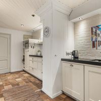 De keuken is landelijk van stijl, maar modern in gebruik: een 5-pits gasfornuis, vaatwasser, oven en meer staan klaar om culinaire ideeën tot leven te brengen. De bijkeuken met witgoedaansluitingen en separaat toilet maakt het plaatje compleet.