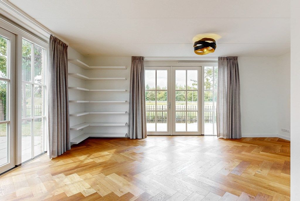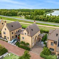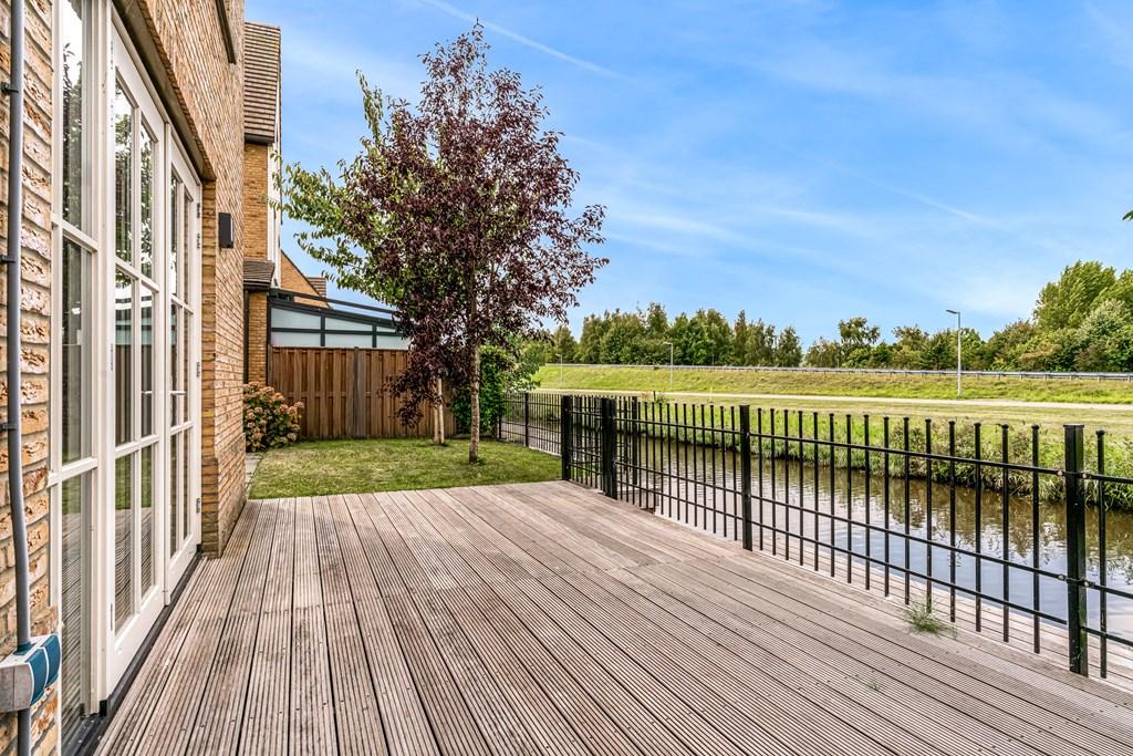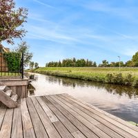 Via de openslaande deuren in de woon- en eetkamer bereik je de royale tuin, waar een stijlvolle vlonder aan het water ligt, een plek om de hele dag van de zon te genieten. De woning telt vijf ruime kamers die als slaap-, werk- of hobbyruimte kunnen dienen, en beschikt over twee badkamers. Dankzij vloerverwarming door het hele huis, energielabel A en tien zonnepanelen is de woning bovendien zeer energiezuinig.