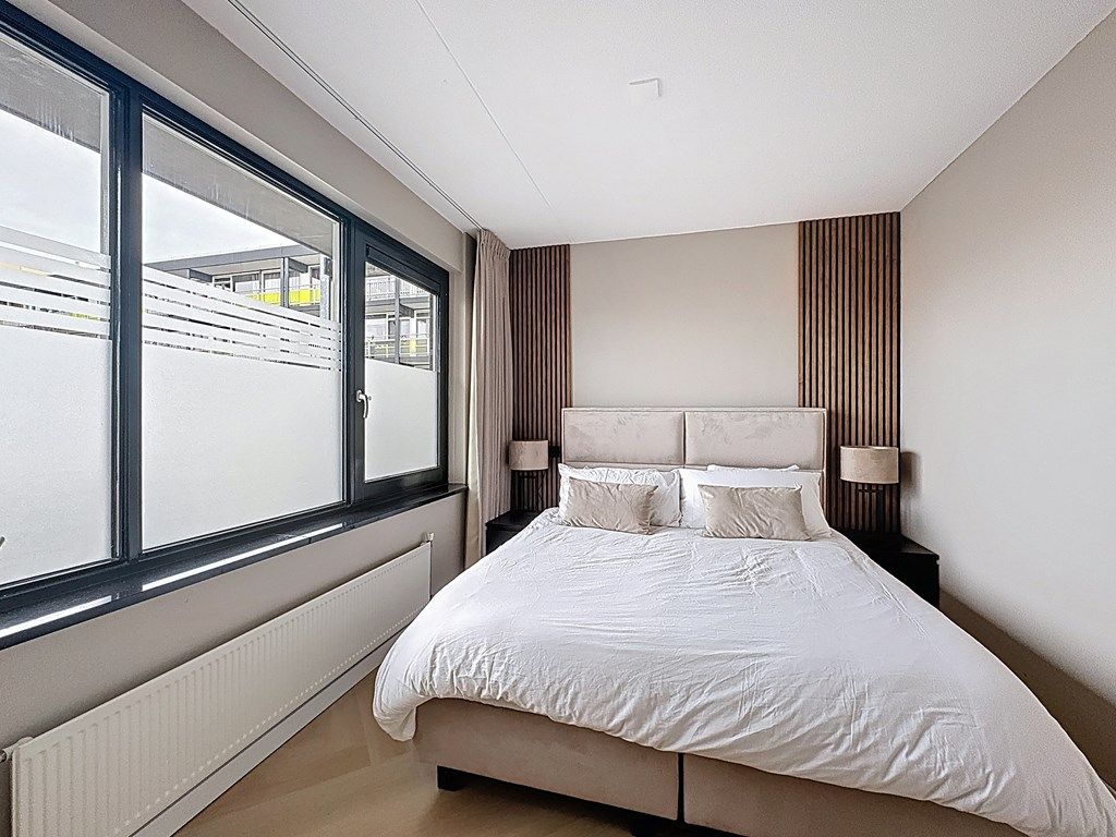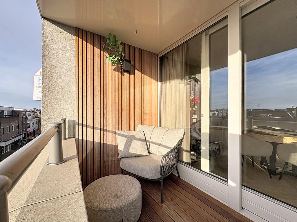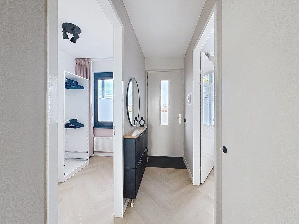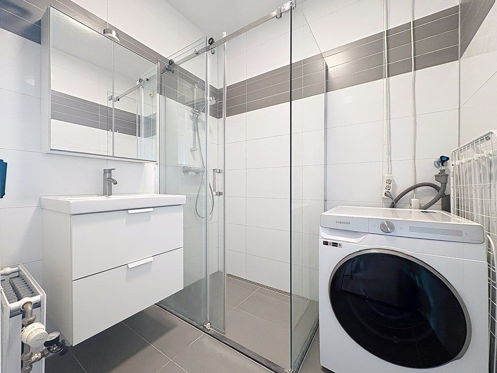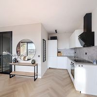 The living room features a modern and spacious open-plan kitchen equipped with an induction hob, a combi oven, a dishwasher, and a large fridge-freezer combination. The living room also provides access to the balcony, where you can enjoy a beautiful unobstructed view over the rooftops of the charming Amsterdamse neighborhood. The bathroom is fitted with a walk-in shower, a washbasin with vanity unit, and a washing machine connection.