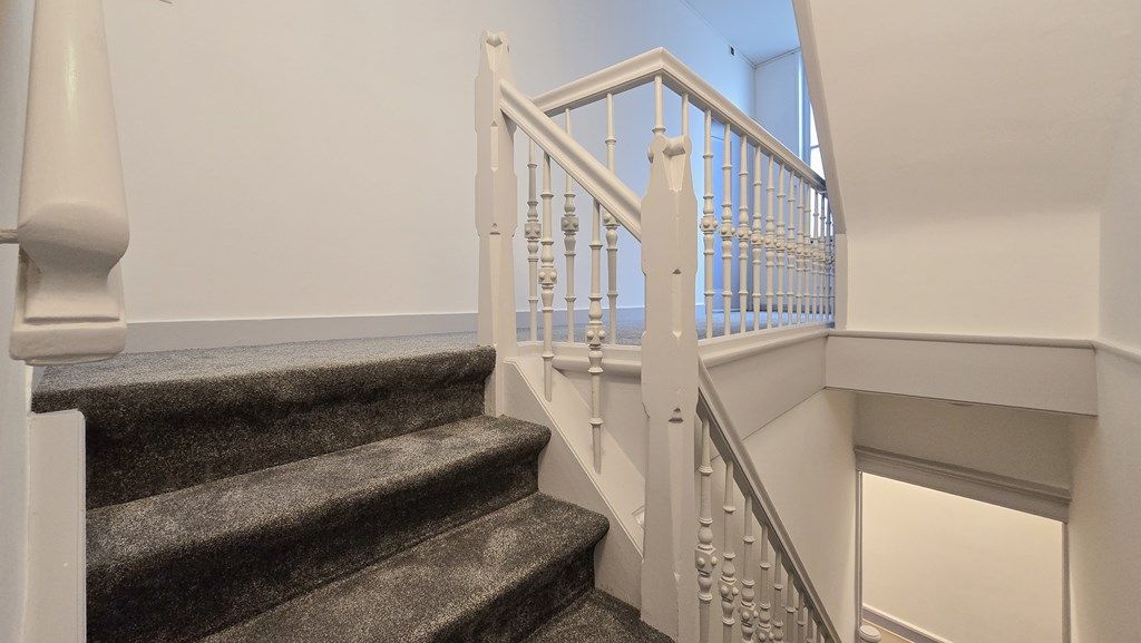 Through the elegant shared entrance, you reach the second floor via the staircase. The spacious living room at the front boasts large windows that provide abundant natural light and a charming view over the city. From the living room, there is access to one of the bedrooms. The second, larger main bedroom is located at the quiet rear side of the apartment.