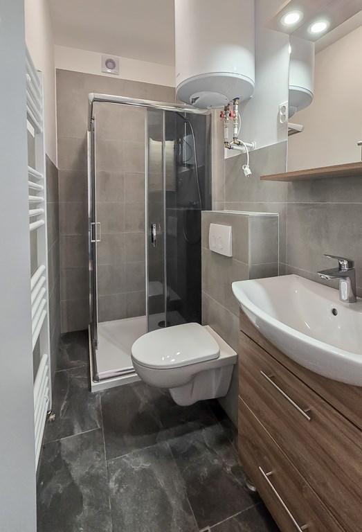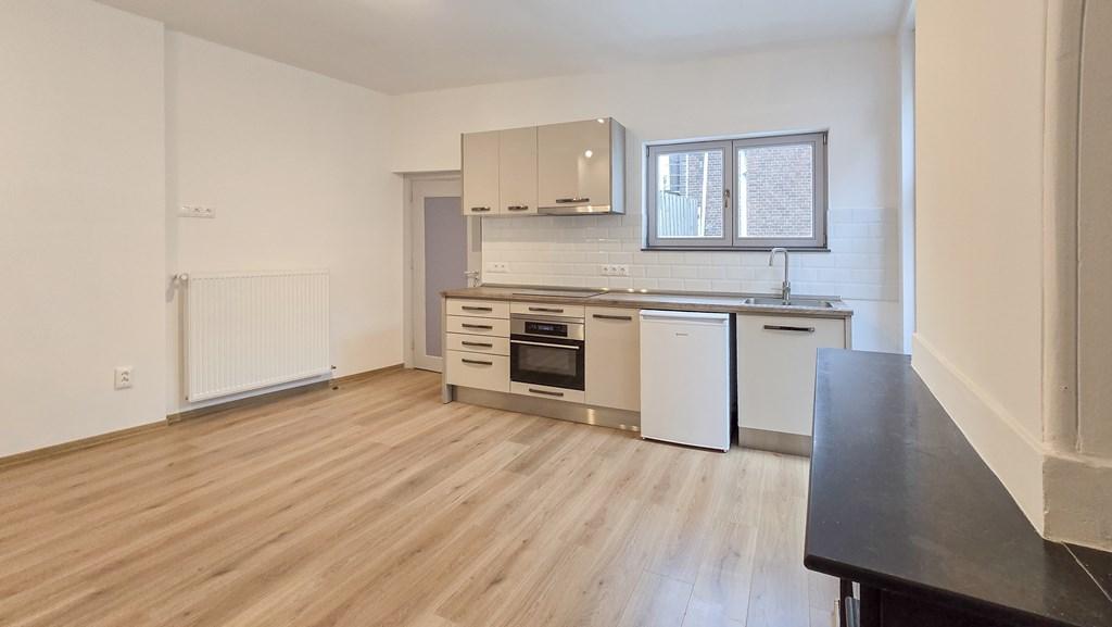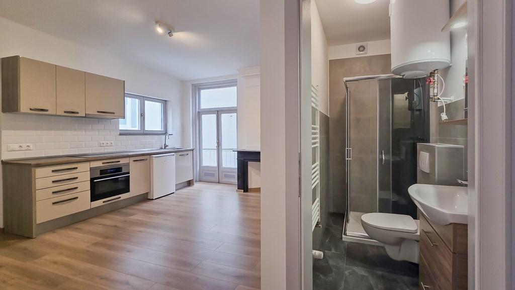 Through the shared entrance, you reach the first floor via the staircase, which provides access to the studio at the back of the property. The studio features a living/sleeping area (ideal for a fold-down bed or sofa bed), an open kitchen with built-in appliances and induction cooking, and a separate bathroom equipped with a shower, washbasin, and toilet.