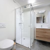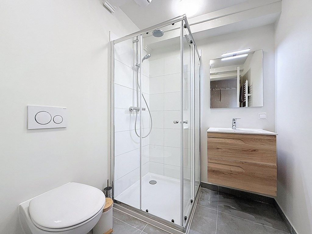 The modern bathroom has also been completely renewed and features a walk-in shower, elegant washbasin cabinet, and toilet. A practical storage closet neatly conceals the washing machine, ready for immediate use.