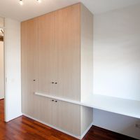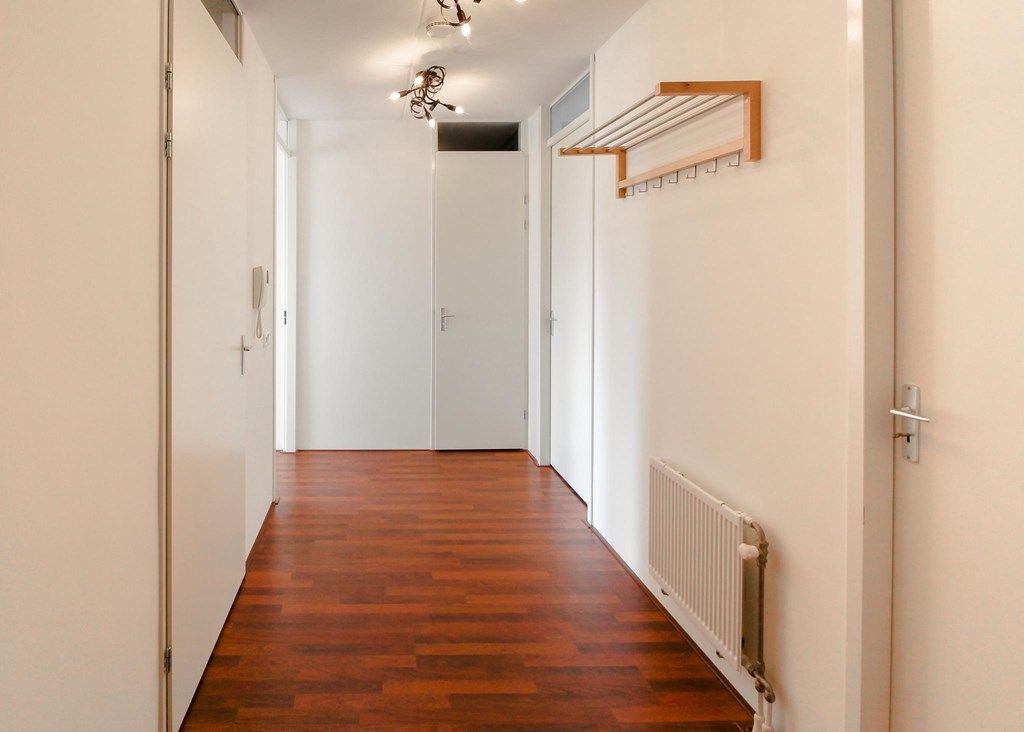 The master bedroom is located at the rear and has a neat built-in wardrobe. There is still enough space in this bedroom for extra cupboards. The second bedroom can also be used as an office. The bathroom has a walk-in shower, washbasin and towel radiator. In the hall there is also a spacious storage room with connection for washing machine and dryer and cupboard wall.