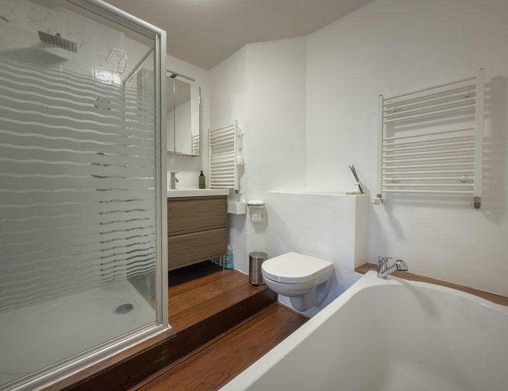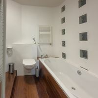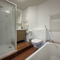 The bathroom is practical and complete, featuring a bathtub, shower, toilet and washbasin. In addition, the apartment has a spacious storage room on the ground floor, ideal for storing a bicycle or extra belongings.
