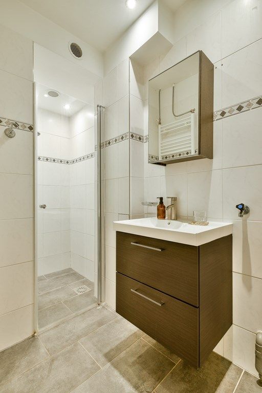 - Bathroom with walk-in shower, washbasin, and vanity unit
