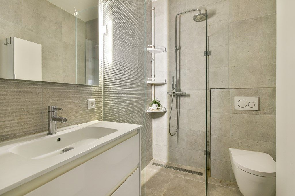 Both bedrooms in this apartment are well-sized. The luxurious bathroom is fully tiled to the ceiling and features a walk-in shower, modern washbasin with mirror and indirect lighting and a second toilet. The guest toilet with small sink is finished in the same high-end style.