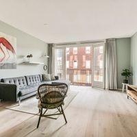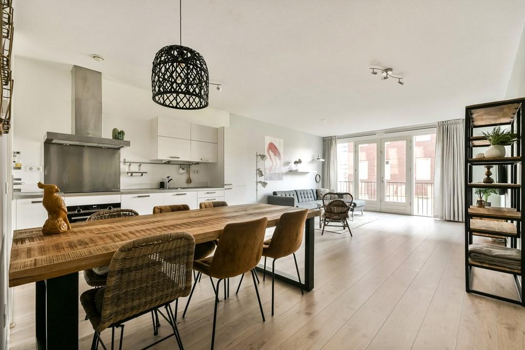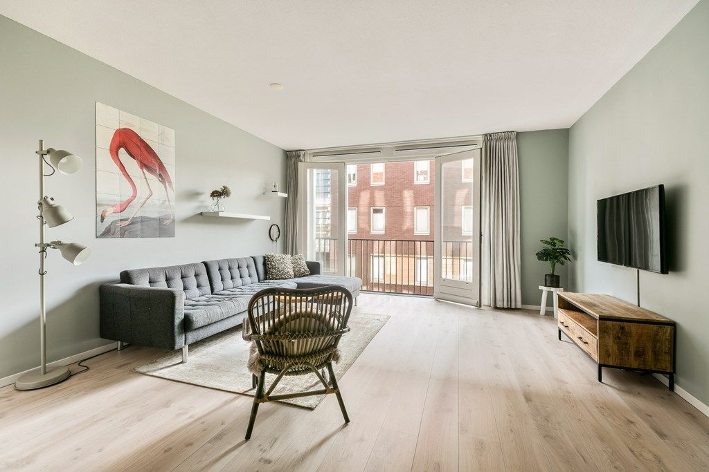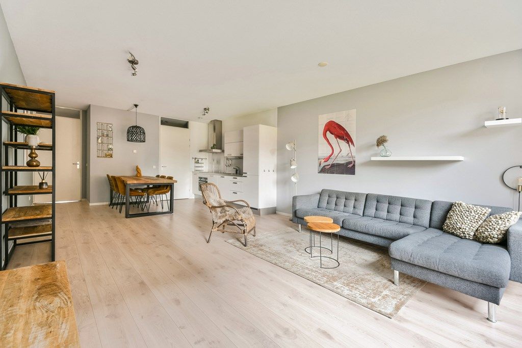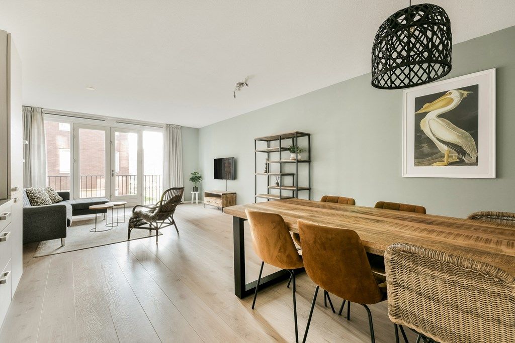 Woonkamer: Licht, sfeervol en praktisch in te delen met een fijne zithoek en plek voor een eettafel. De grote ramen met frans balkon op het zuiden zorgen voor volop daglicht.