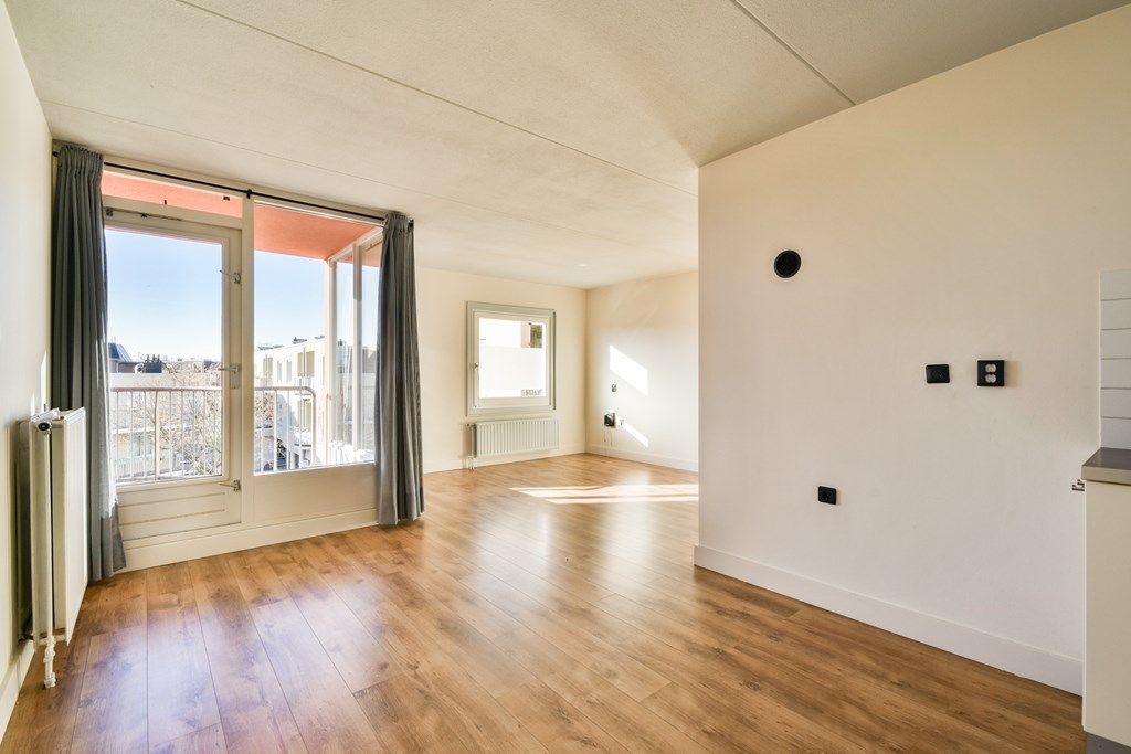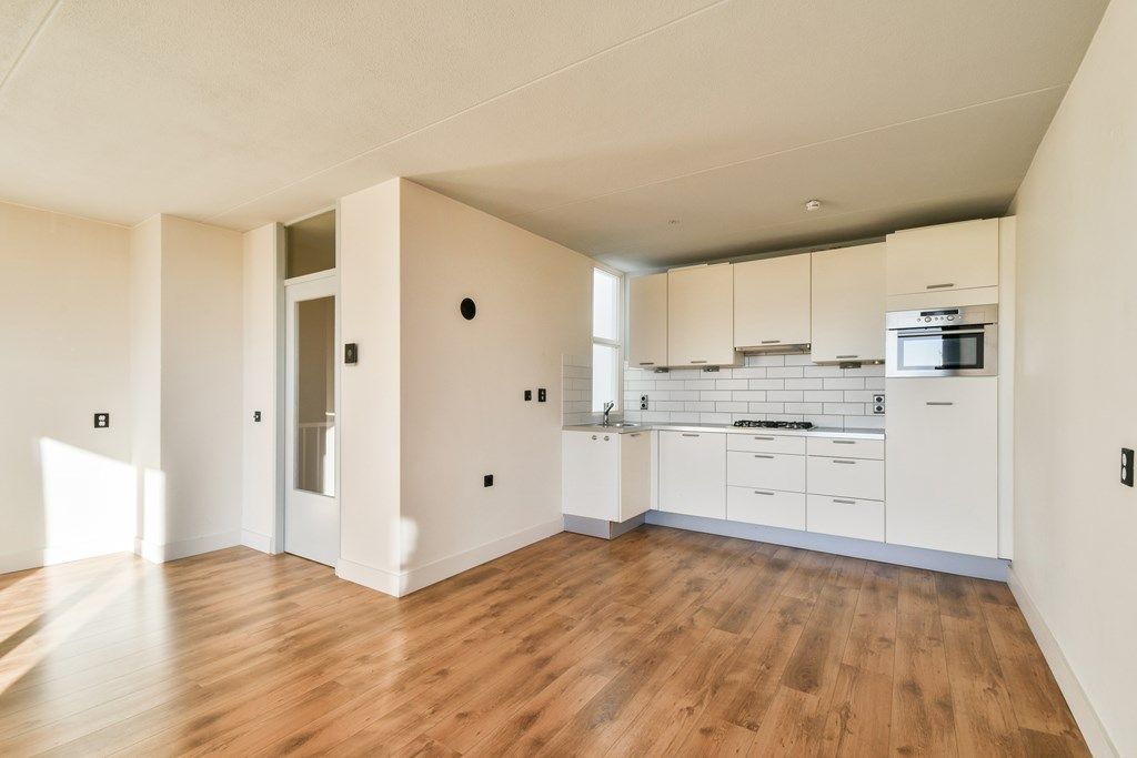 Overloop met vaste kast en C.V.-opstelling. Open keuken met 4-pits gasfornuis, koelkast, vaatwasser, oven en afzuigkap. Lichte woonkamer met laminaatvloer en toegang tot het balkon op het zuidwesten.