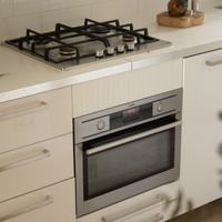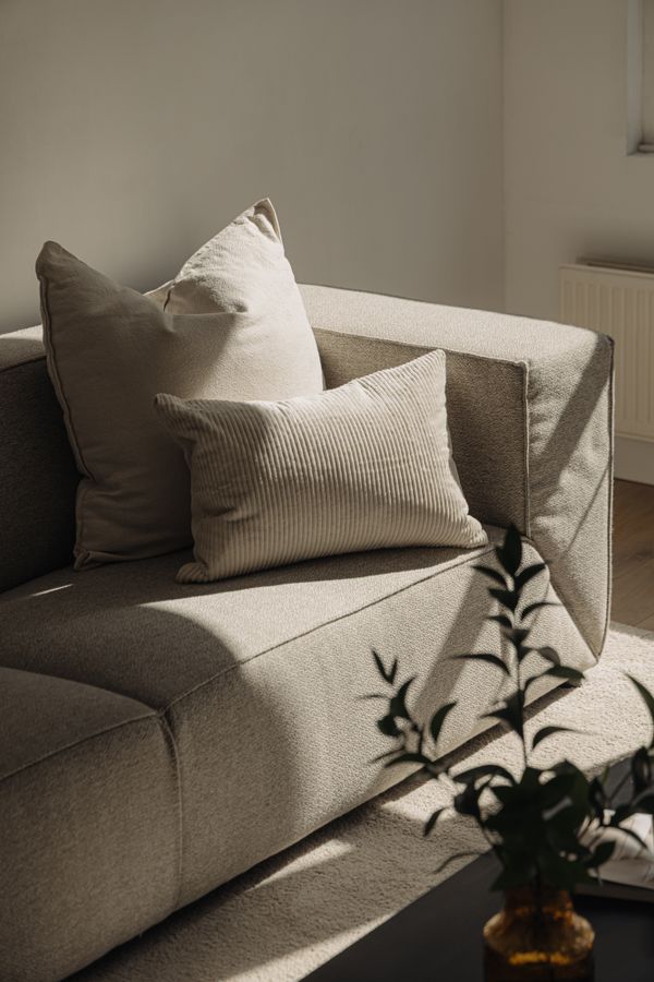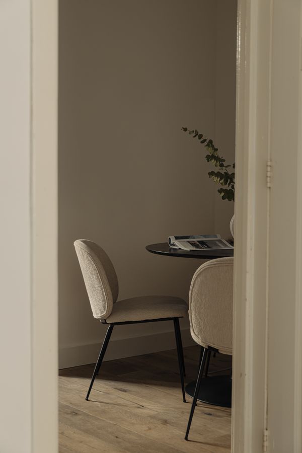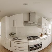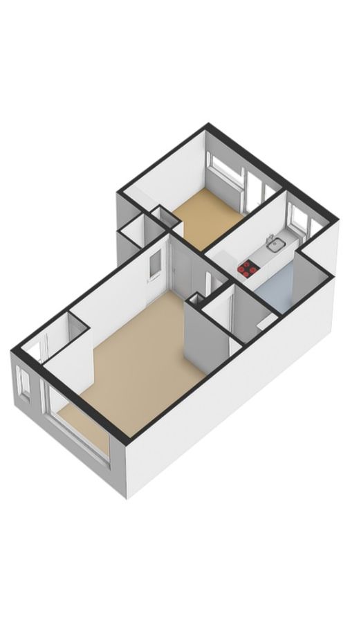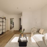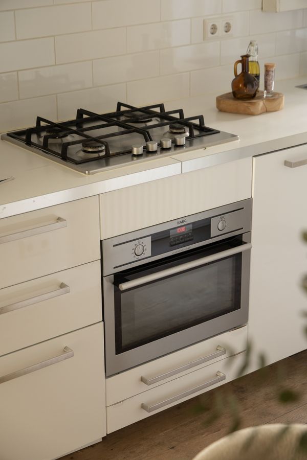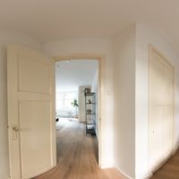 Entry via private front door takes place in the hallway. Here, coats can be hung up and shoes taken off. Another door opens into the spacious living room, which gives access to all rooms. The living room is a nice, open space with large windows, making it also a bright room. At the rear of the apartment is the kitchen, which has built-in appliances such as a fridge, combi-oven, 4-burner gas hob and built-in extractor fan. There is plenty of storage space and the L-shape of this kitchen also allows space for the dining table.