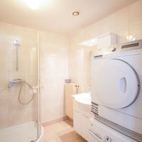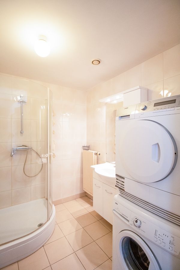 Entrance takes place in the hall with wardrobe space. The bright living room offers lots of natural light and includes a dining table with chairs. Sliding doors provide access to the sunny balcony. The semi-open kitchen is located at the rear of the apartment and is equipped with a refrigerator, freezer, gas hob, and extractor fan. The apartment offers a spacious primary bedroom with room for a double bed and wardrobes. The second bedroom is ideal as a child’s room or home office. The bathroom is fitted with a shower, washbasin, washing machine, and dryer. A separate toilet is also present.