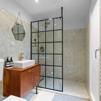 The second floor has a second bedroom that is tastefully furnished with a double bed, a built-in wardrobe at the front and a private bathroom with washbasin, toilet and walk-in shower.