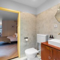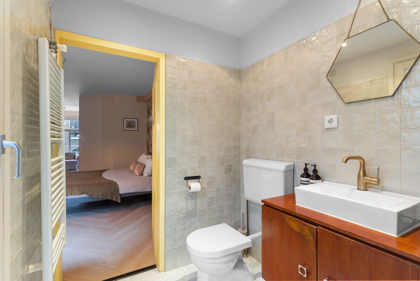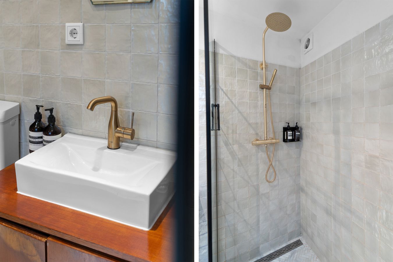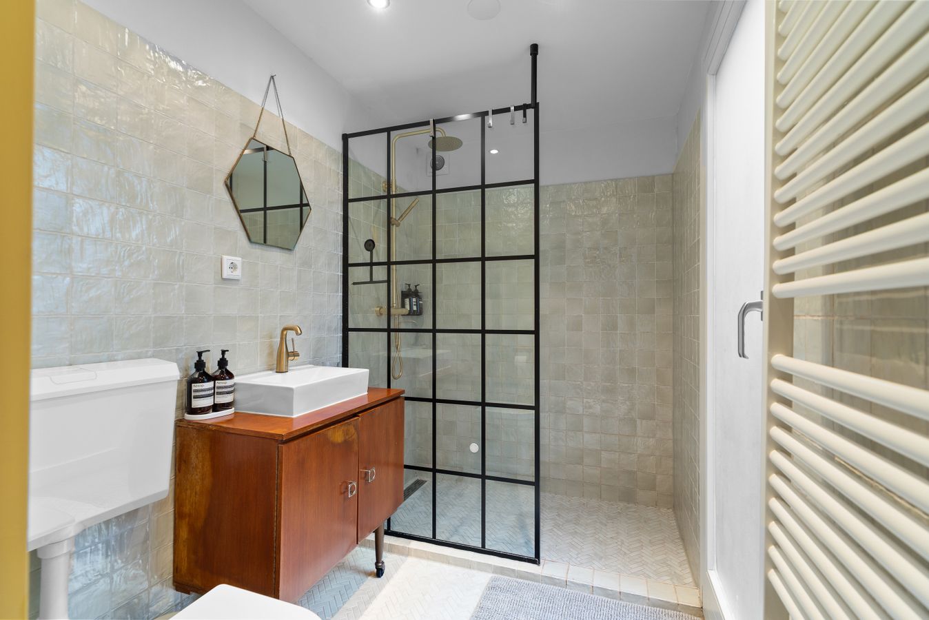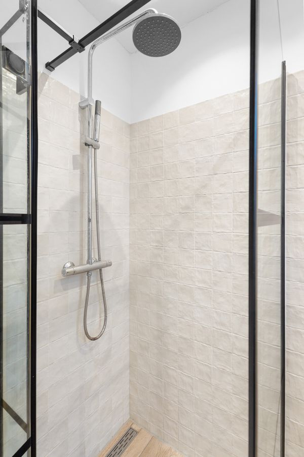 Entrance leads to the first floor. Here you will find a spacious bedroom with a double bed, sitting area and a modern bathroom with a walk-in shower, washbasin and toilet. At the rear is a lovely spacious roof terrace of approximately 20m².