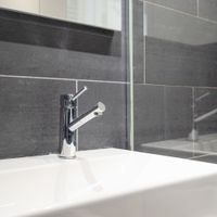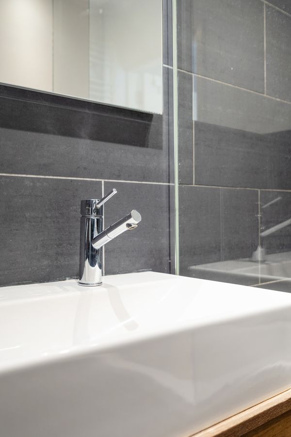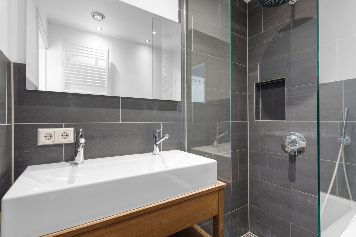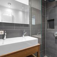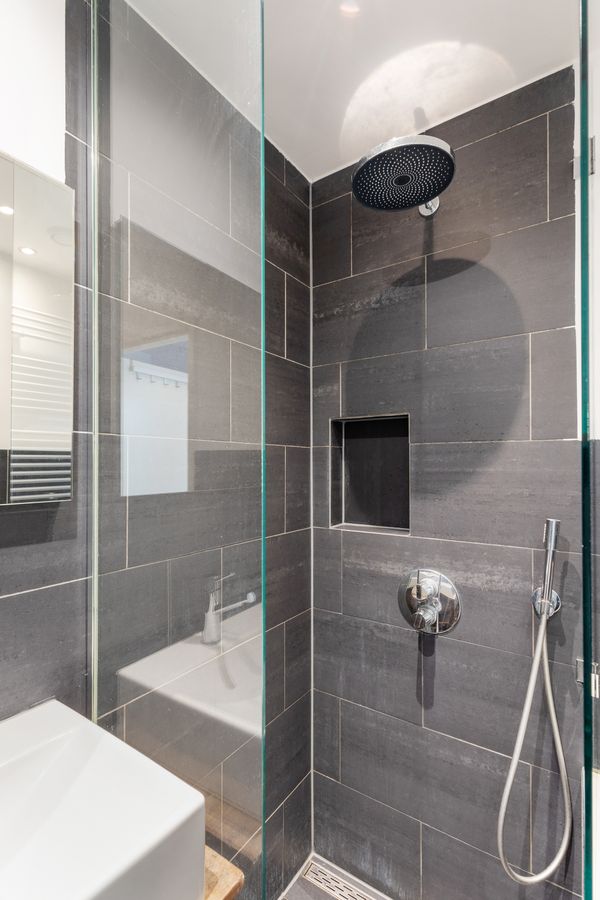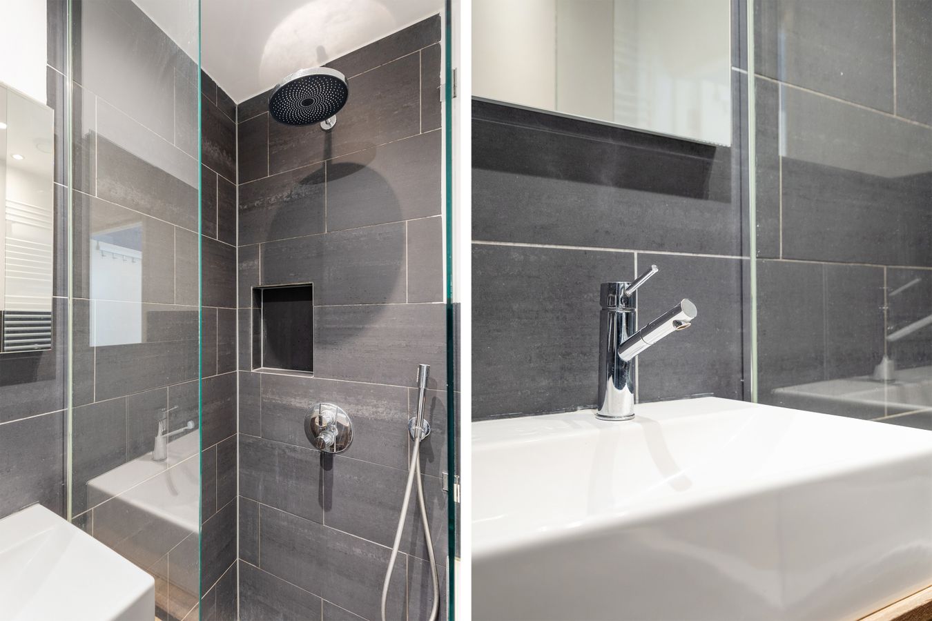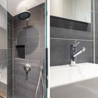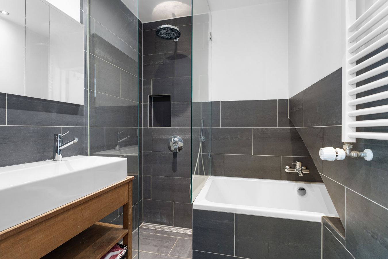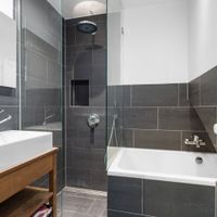 The neat, modern bathroom is equipped with a bath, walk-in shower and washbasin. The separate toilet is accessible via the hall.