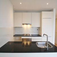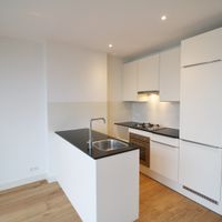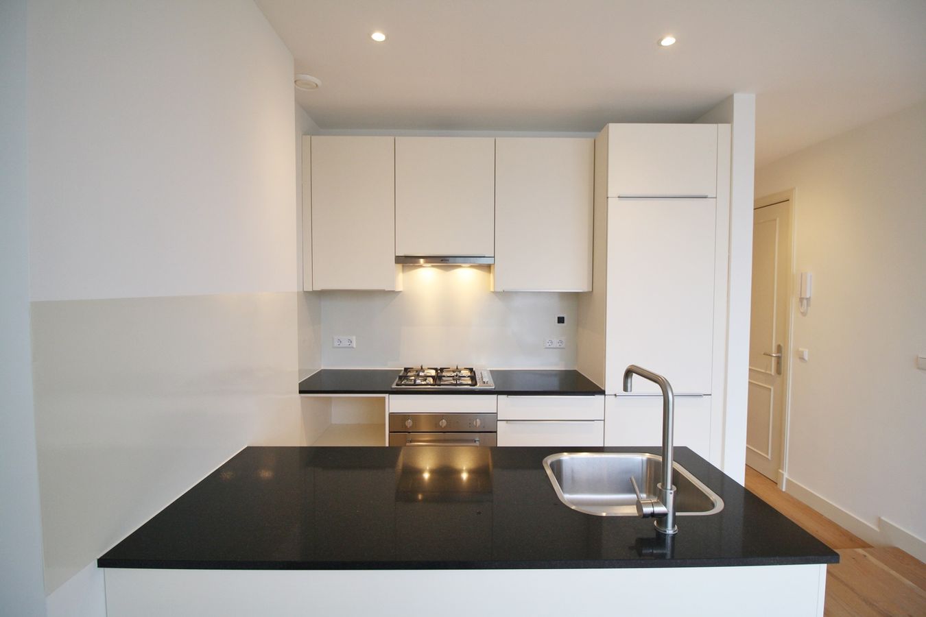 The bright living room features an open-plan kitchen and provides access to the spacious balcony at the rear of the apartment. The modern, newly installed kitchen is equipped with various built-in appliances, including a fridge/freezer combination, cooktop, extractor hood, and dishwasher.
