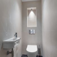 The spacious bedroom has a comfortable walk-in closet. The luxurious, new bathroom has a walk-in shower, modern washbasin and designer radiator. The toilet is separate from the bathroom. There is also a practical storage cupboard with a washing machine and dryer.