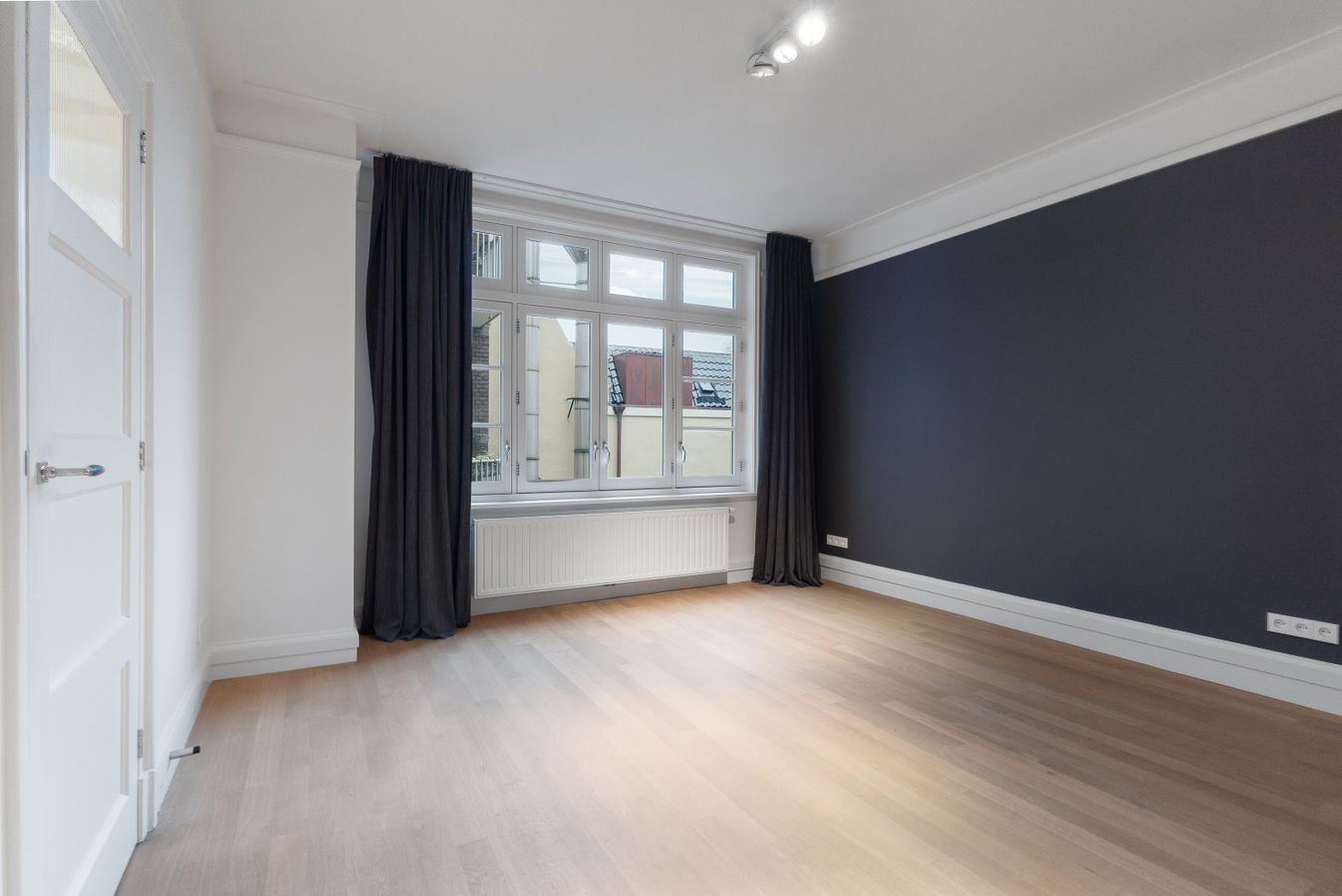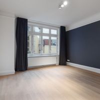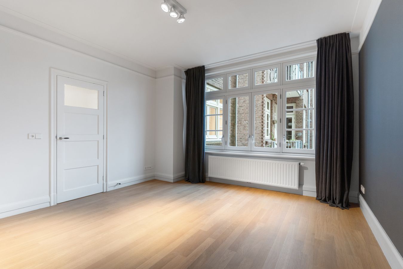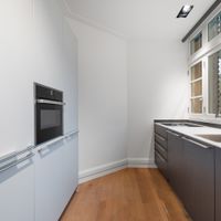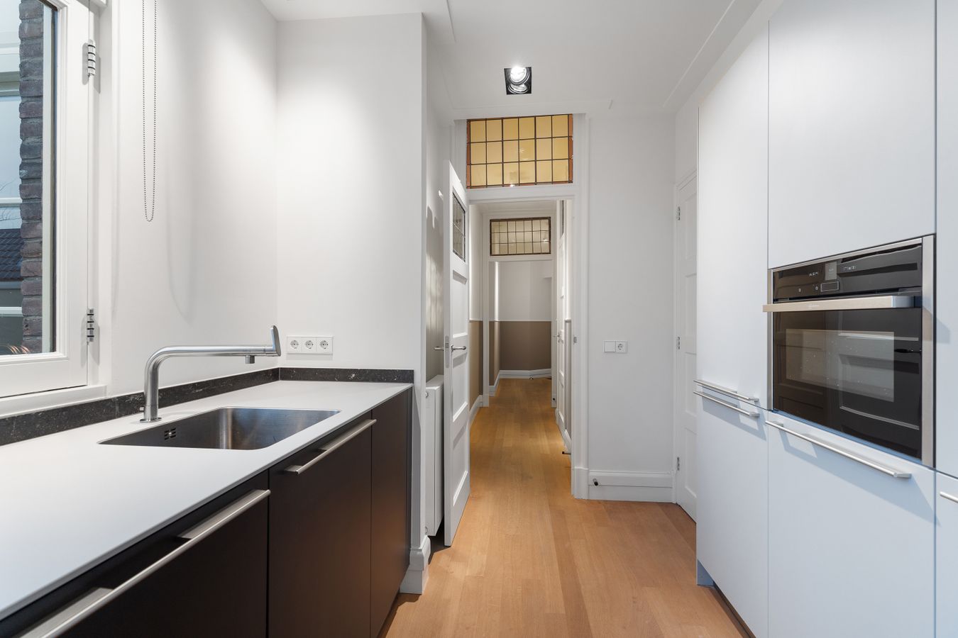 The apartment can be reached via the staircase or lift. The spacious entrance leads to a particularly light and spacious living room with balcony. The living room has wooden flooring, built-in cupboards and beautiful authentic details. The balcony overlooks Vijzelstraat.