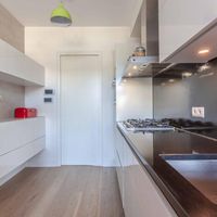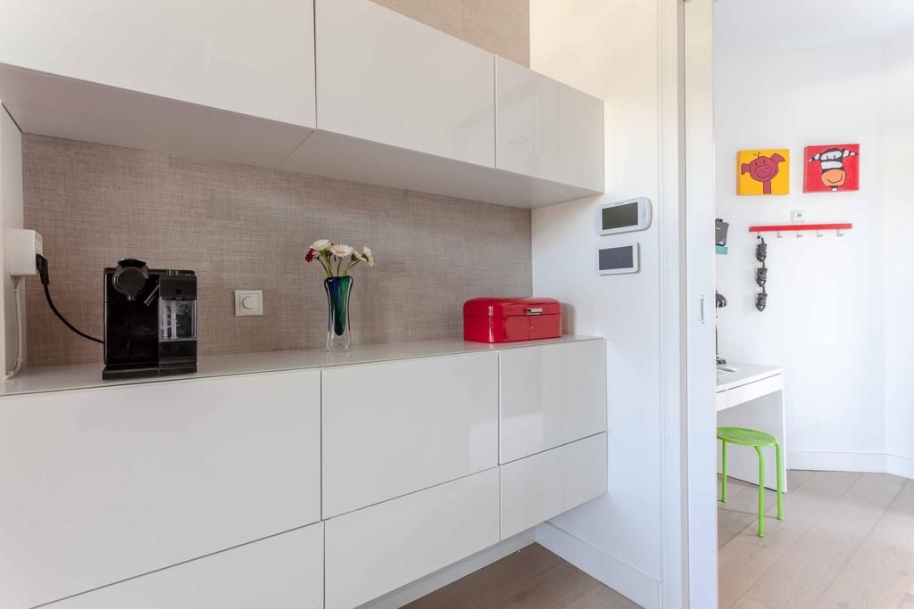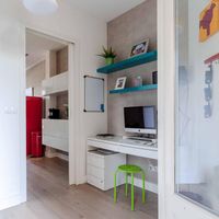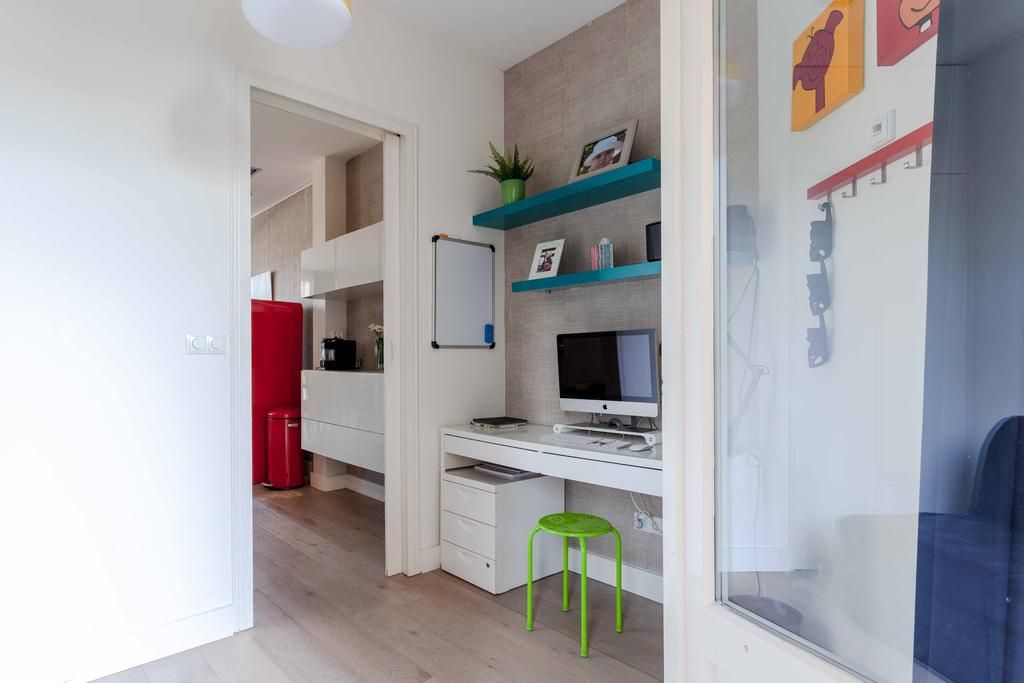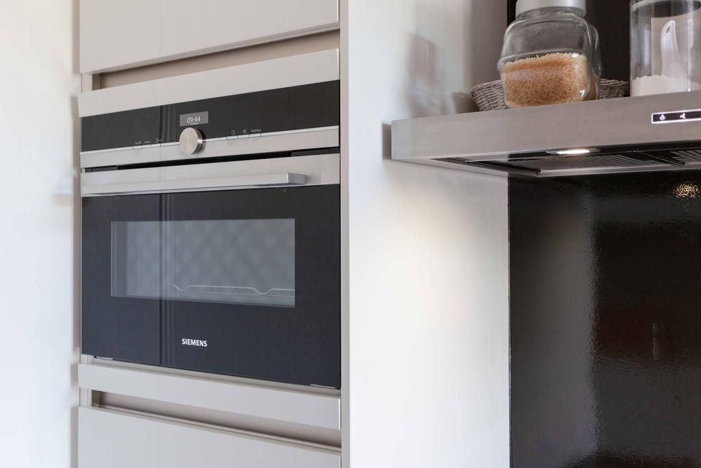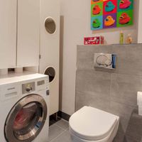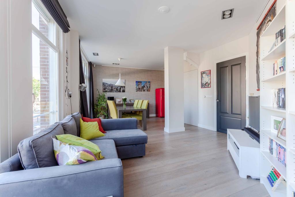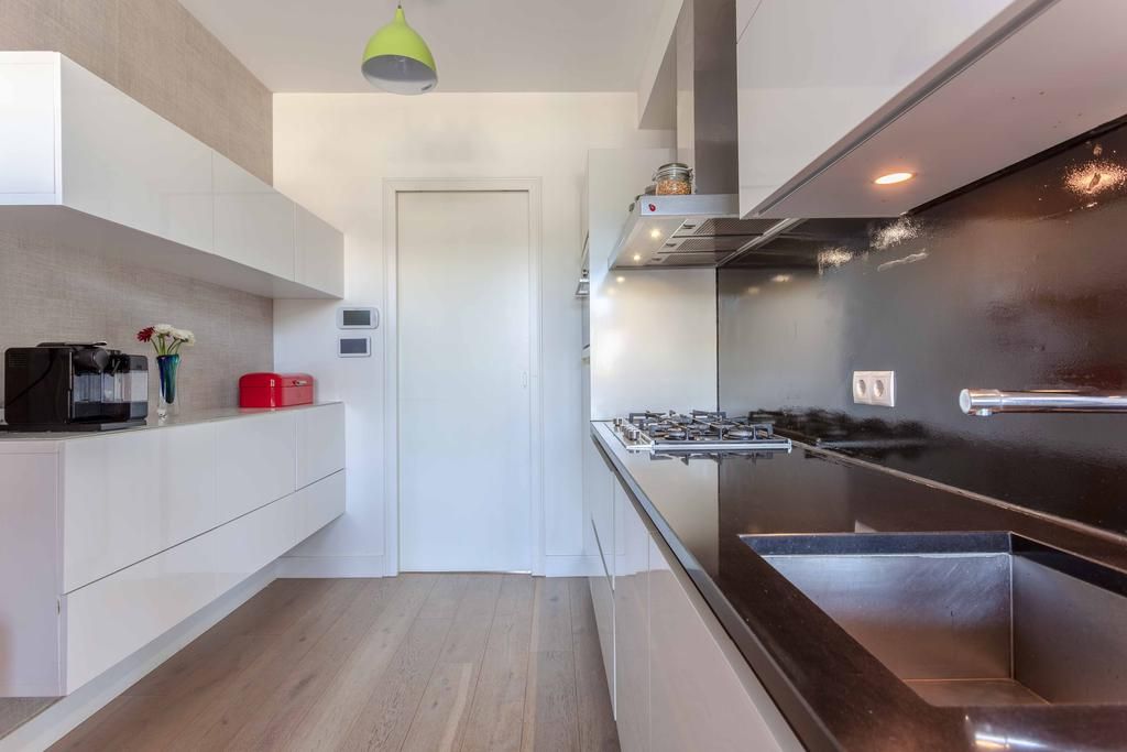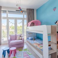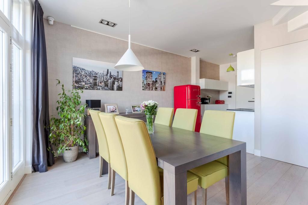 The spacious living room has a TV corner where you can enjoy your retreat. Partly because of the many windows, it is a very light and cosy living room. The apartment also offers French balcony doors. The half-open kitchen is equipped with all conveniences. Thus, all present appliances are fully built-in. There is a combi oven, induction hob, dishwasher, extractor and plenty of storage space. There is a separate fridge/freezer. Right next to the kitchen, there is enough space to invite guests for a nice dinner and, of course, to sit down with the family for dinner.