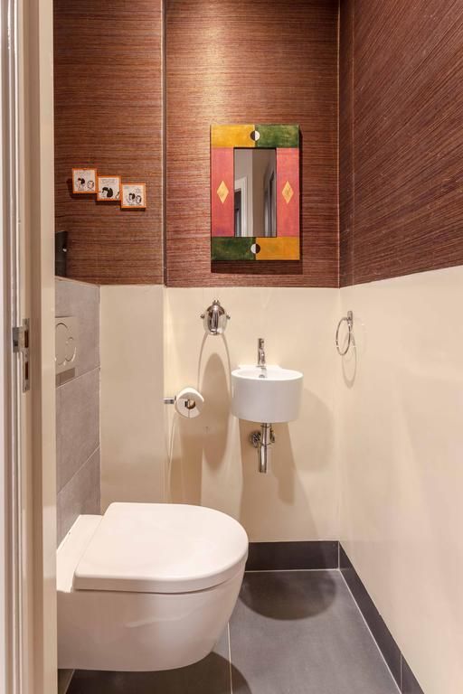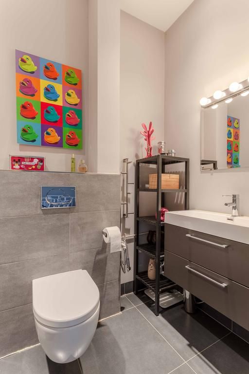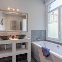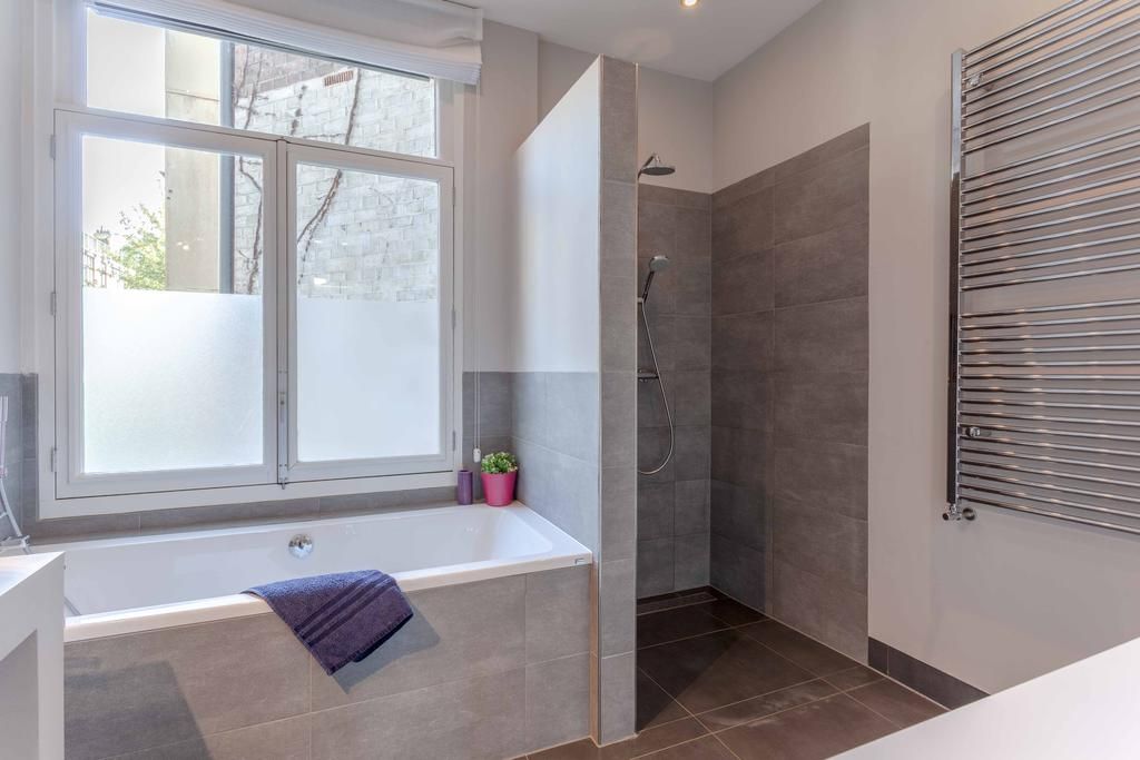 The modern bathroom exudes luxury. There is a generous bathtub, walk-in shower, toilet, radiator and 2 washbasin.
