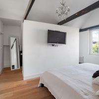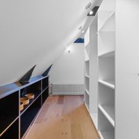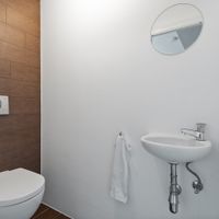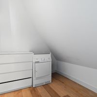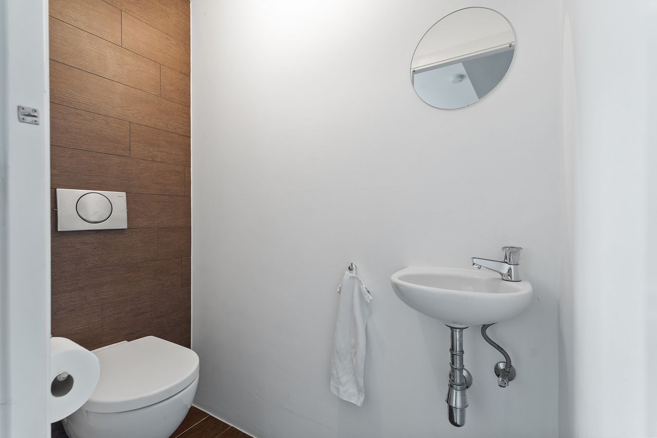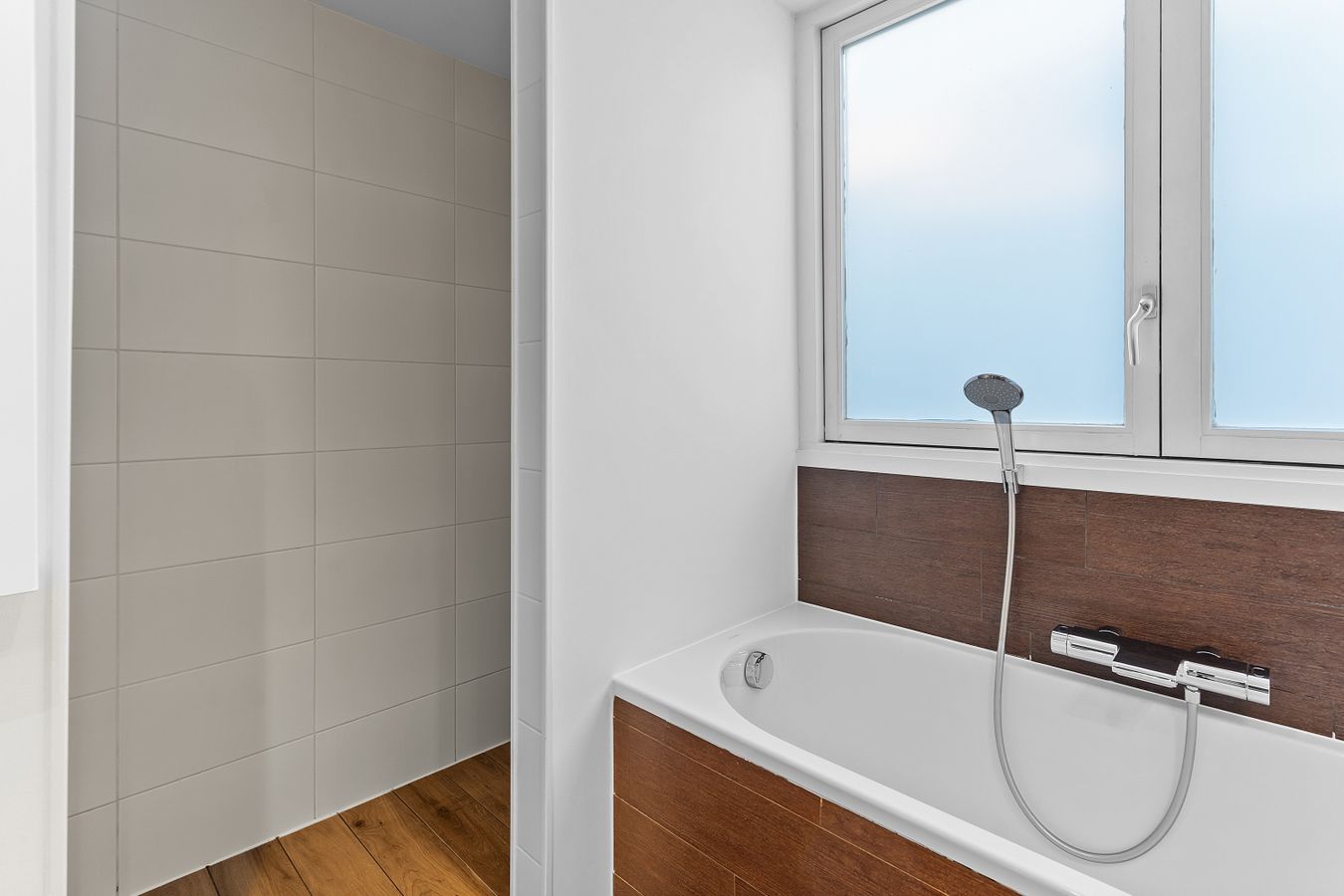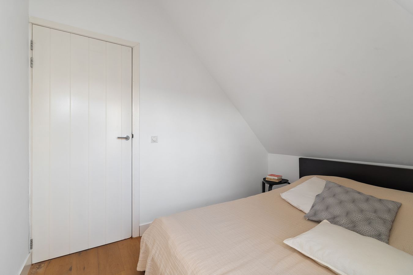 An internal staircase leads to the top floor, where you'll find the generous master bedroom with charming exposed wooden beams and a spacious walk-in closet. Additionally, there are two more (bed)rooms, one of which is currently used as a storage room with a washer and dryer setup. The contemporary bathroom includes a walk-in shower, bathtub, and washbasin unit. A second separate toilet and a laundry closet with washing machine connection are also located on this floor.