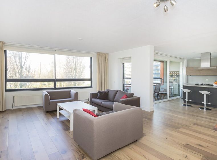 From the hall, all rooms can be reached. Because of the large windows in the living room, the flat offers plenty of light and this spacious room is set in a fresh way. From the living room, the large balcony can be accessed to enjoy cool summer evenings. The balcony measuring 6m2 is located at the rear of the flat. From the balcony, you overlook the courtyard with lots of greenery. The dining room area adjoins the modern kitchen which is equipped with all conveniences and built-in appliances such as a fridge, freezer, oven, extractor and a 4-burner induction hob. As icing on the cake, it is also possible to make a quick cup of tea using the boiling water tap.