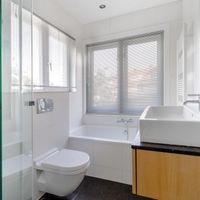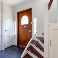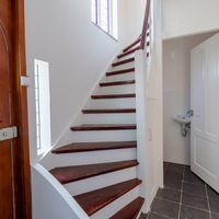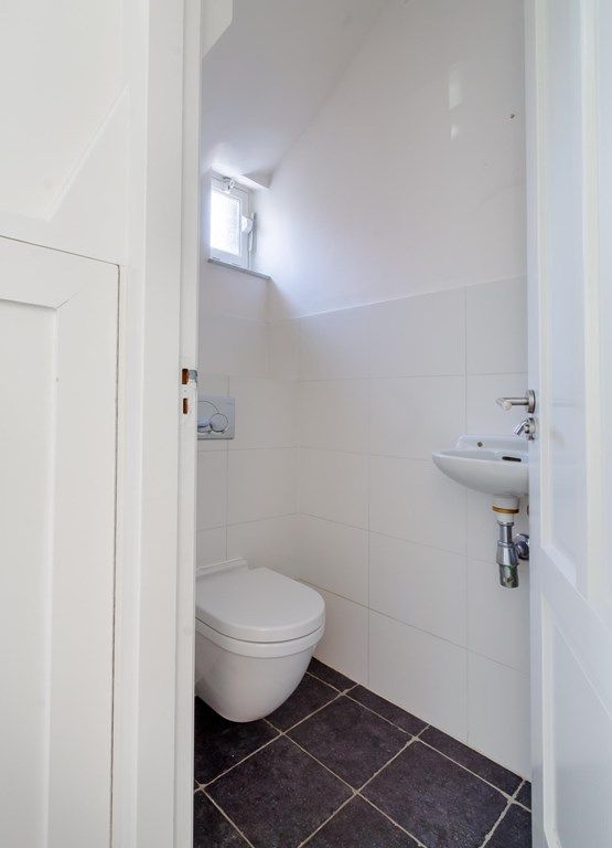 From the hall, where the first toilet with fountain is located, the first floor is accessible. On this floor there are 3 bedrooms and the bathroom. This bathroom has a walk-in shower, bath, washbasin and a second toilet. The two spacious bedrooms at the front and rear both have doors opening onto a balcony.